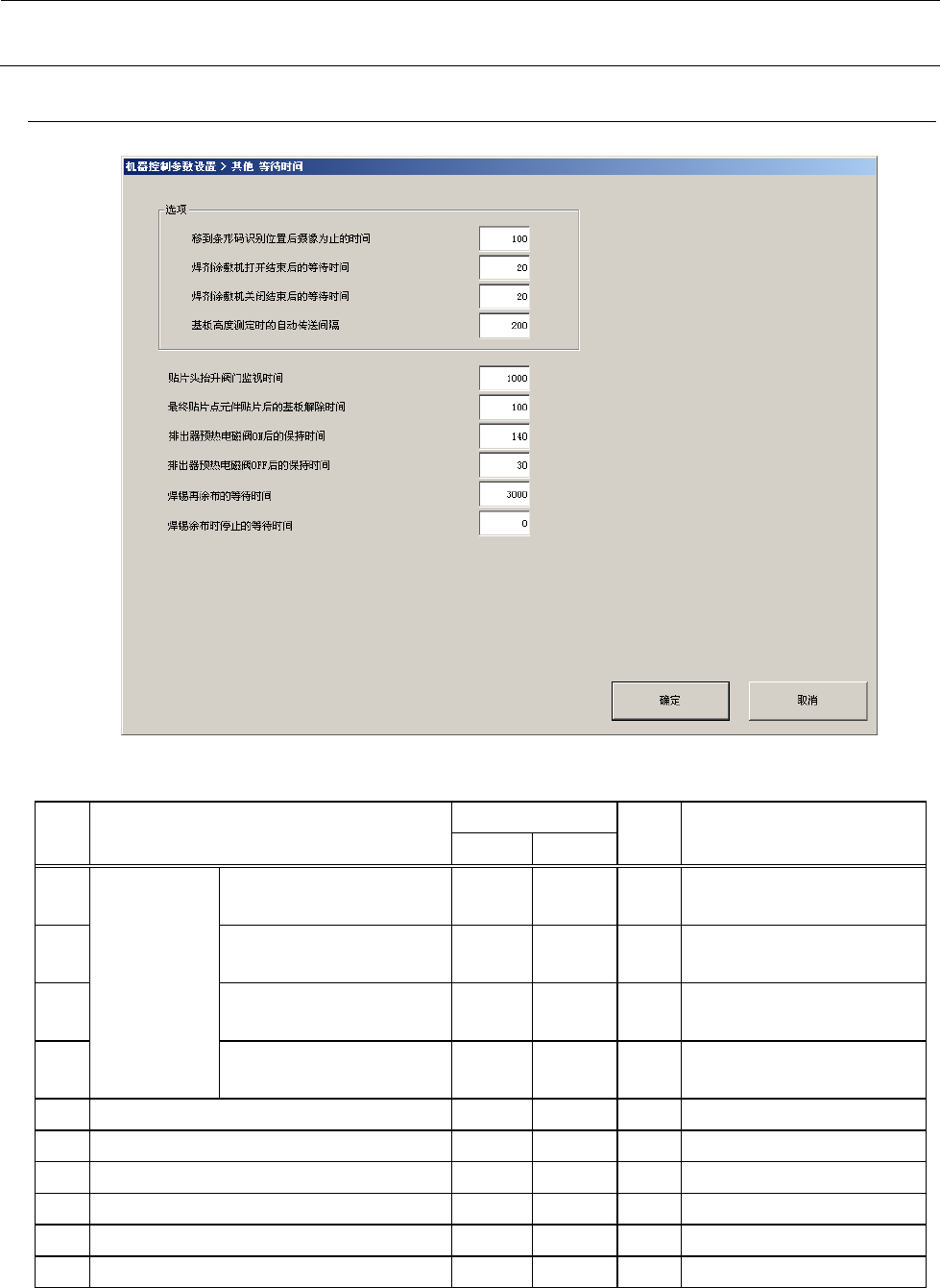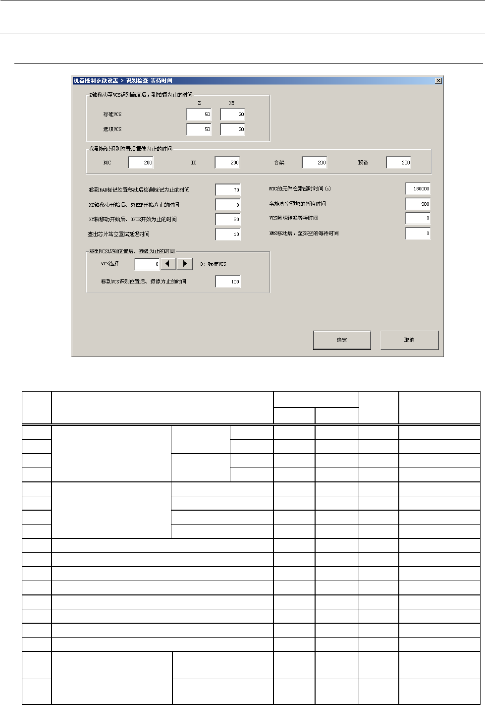 机器控制参数 2- 92 2-5- 13 其他等待时间 2-5- 13 -1 设定项目 No. 项目 输入范围 单位 备考 最小值 最大值 1 选项 移到条形码识别位置后 摄像为止的时间 2 焊剂涂敷机打开结束后 的等待时间 3 焊剂涂敷机关闭结束后 的等待时间 4 基板高度测定时的自动 传送时间 5 贴片头抬升阀门 监视时间 6 最终贴片点元件 贴片后的基板解除时 间 7 排出器预热电磁 阀 ON 后的保持时间 8 排出器预热电磁 阀…