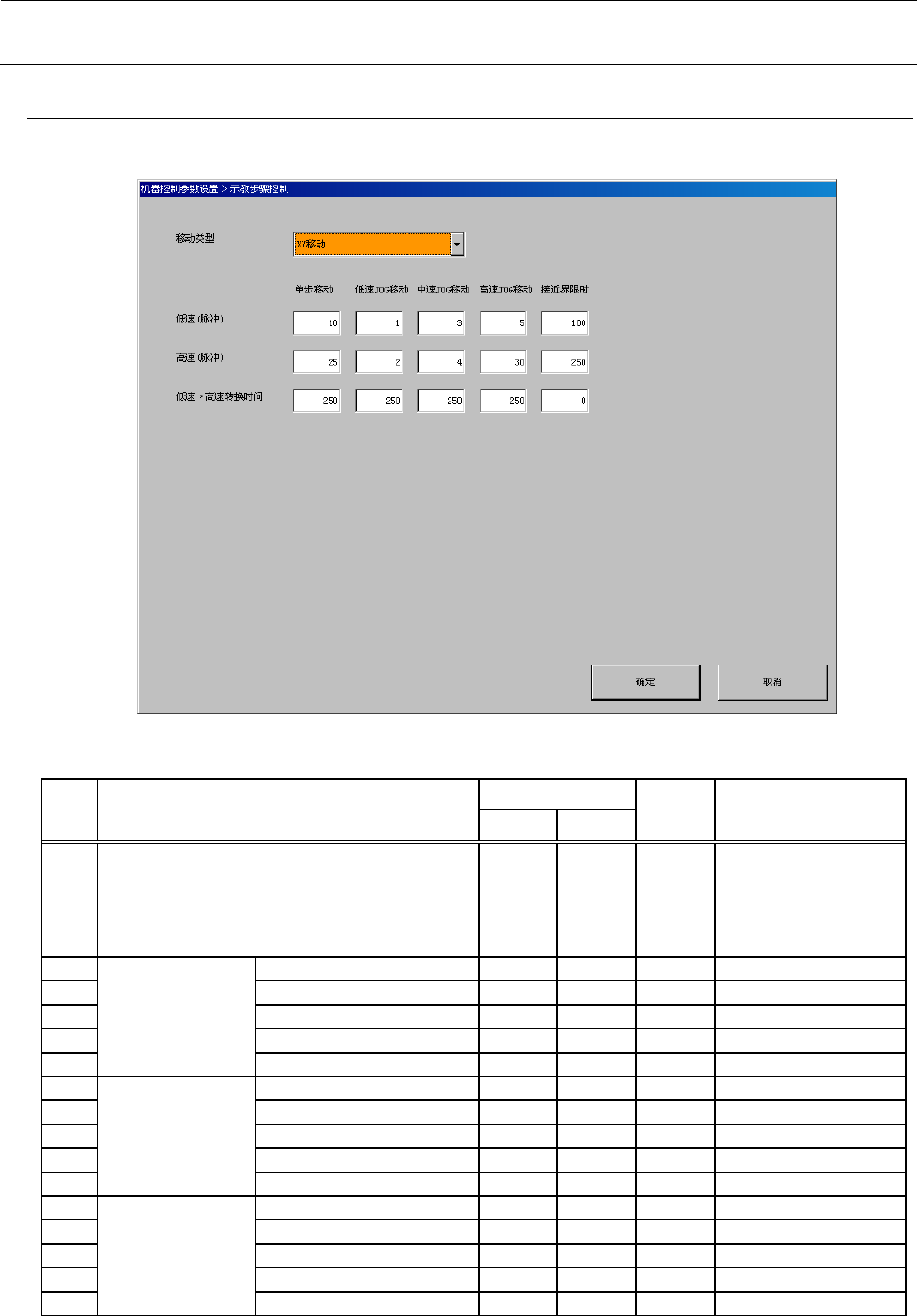 机器控制参数 2- 97 2-5- 18 示教步骤控制 接近界限时的 [ 低速 (脉冲) ] 、 [ 高速 (脉冲) ] 、 [ 低速 → 高速转换时间 ] 仅 在选择 XY 移动时使用。 2-5- 18 -1 设定项目 No. 项目 输入范围 单位 备考 最小值 最大值 1 移动类型 XY 移动 Z 移动 θ 移动 支撑台移动 AW C 移动 2 低速(脉冲) 单步移动 3 低速 JOG 移动 4 中速 JOG 移动 5 高速 JOG…
