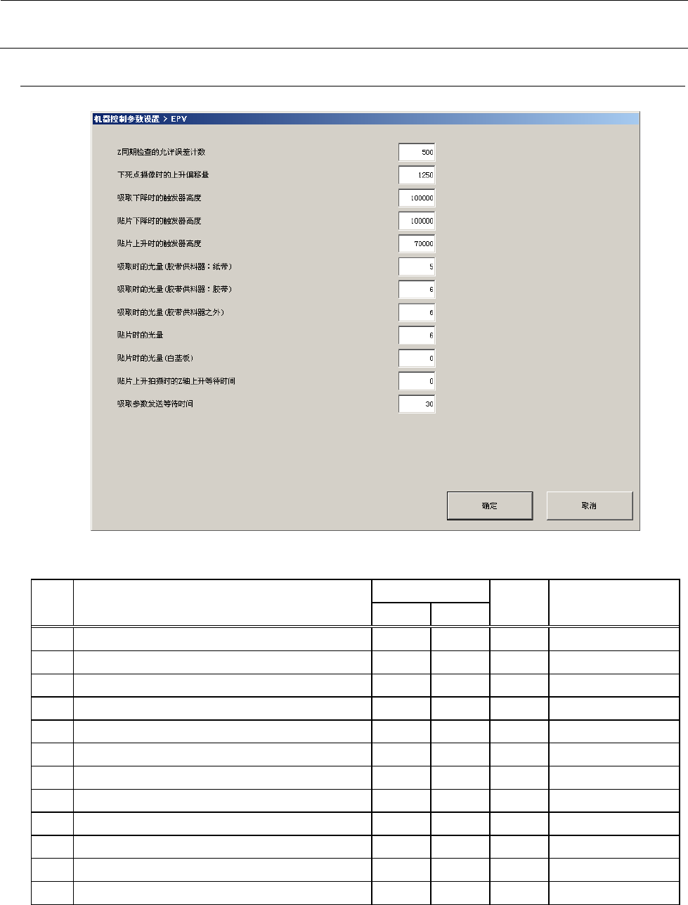 机器控制参数 2- 125 2-5-36 EPV 2-5- 36 -1 设定项目 No. 项目 输入范围 单位 备考 最小值 最大值 1 Z 同步检查的 允许误差 计数 2 下死点摄像时的 上升偏移量 3 吸取下降时的触 发器高度 4 贴片下降时的触 发器高度 5 贴片上升时的触 发器高度 6 吸取时的光量( 胶带供料器:纸带) 0 7 7 吸取时的光量( 胶带供料器:胶带) 0 7 8 吸取时的光量( 胶带供料器之外) 0 7 9 贴…