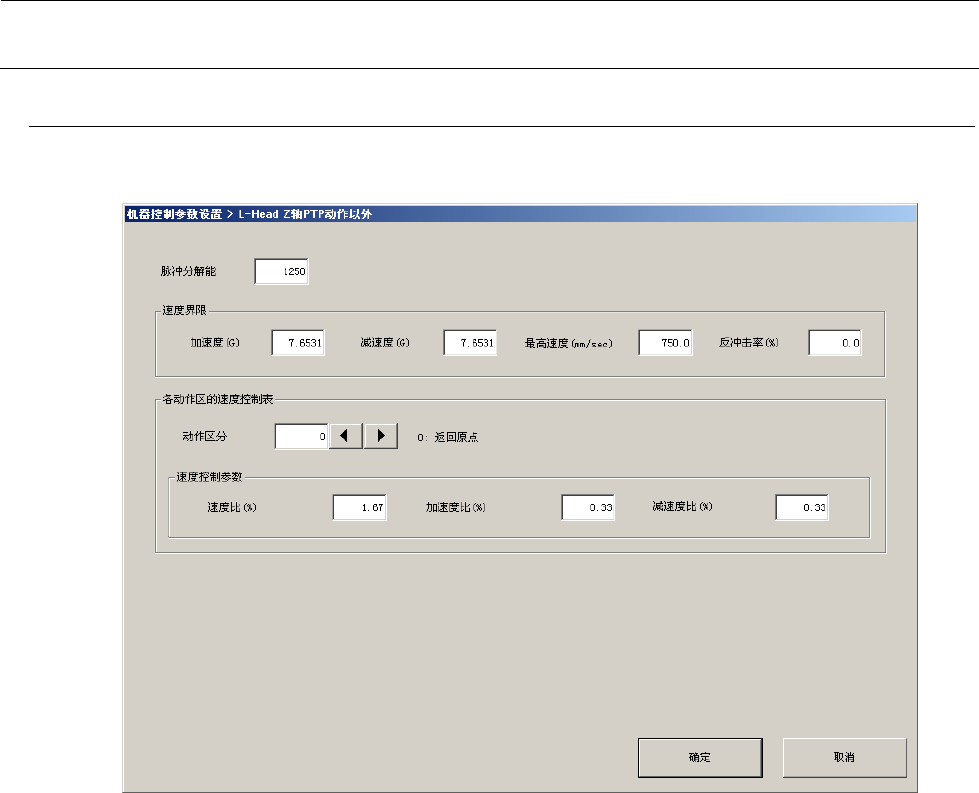 机器控制参数 2-5 2-1-2 L- Head Z 轴 PTP 动作以外 如将 “ 动作区分 ” 设 置为欲编辑的索 引,即可对所 设定的区分中的速 度控制参数进行编辑。