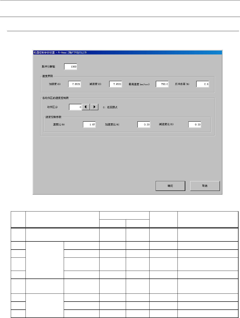 机器控制参数 2- 13 2-1-6 R- Head Z 轴 PTP 动作以外 如将 “ 动作区分 ” 设 置为欲编辑的索 引,即可对所 设定的区分中的速 度控制参数进行编辑。 2-1-6-1 设定项目 No. 项目 输入范围 单位 备考 最小值 最大值 1 脉冲分解能 1nm /Pul s e 2 速度界限 加速度 - 10 10 G 3 减速度 - 10 10 G 4 最高速度 - 100000 0 100000 0 mm /sec…