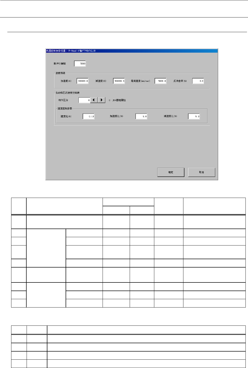 机器控制参数 2- 16 2-1-7-1 设定项目 No. 项目 输入范围 单位 备考 最小值 最大值 1 脉冲分解能 1nm /Pul s e 2 速度界限 加速度 - 10 10 G 3 减速度 - 10 10 G 4 最高速度 - 100000 0 100000 0 mm /sec 5 反冲击率 - 100000 100000 % 6 各动作区的 速度控制表 动作区分 0 7 参照 2-1-7- 2 动作区分 7 速度区分 0 9…
