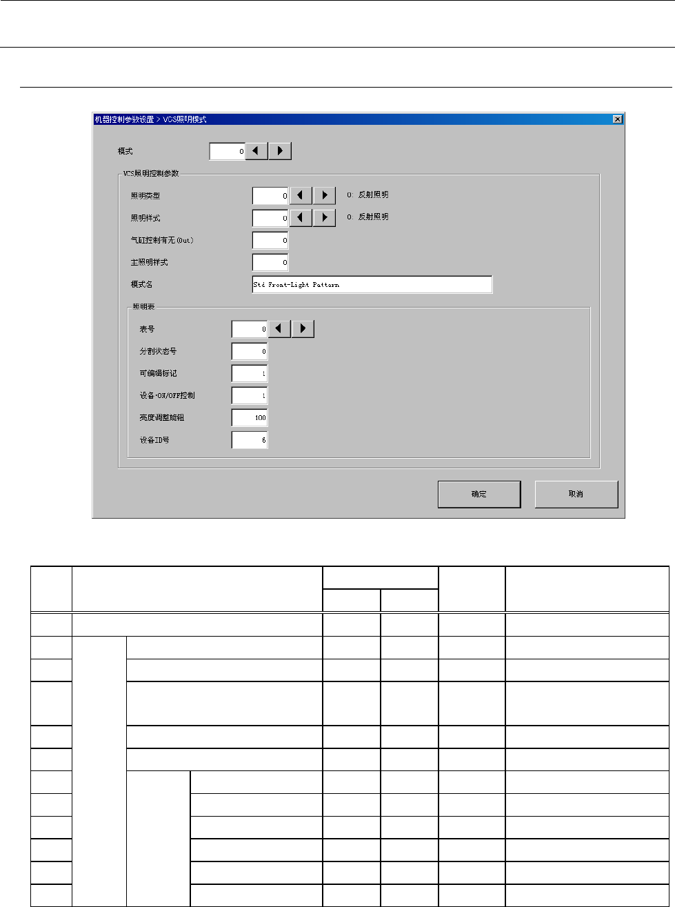 机器控制参数 2- 55 2-4-2-2 照明类型 2-4-2-3 照明样式 No. 类别 内容 1 0 反射照明 2 1 透射照明 3 2 侧面照明 No. 类别 内容 1 0 反射照明 2 1 CB GA 反射照明 3 2 LGA 反射 照明 4 3 ~ 15 预备 5 16 透射照明( 分开纵偶数 ) 6 17 透射照明( 分开块 / 纵奇数 ) 7 18 小元件用透射照 明 8 19 ~ 31 预备 9 32 侧面照明( 红、无…