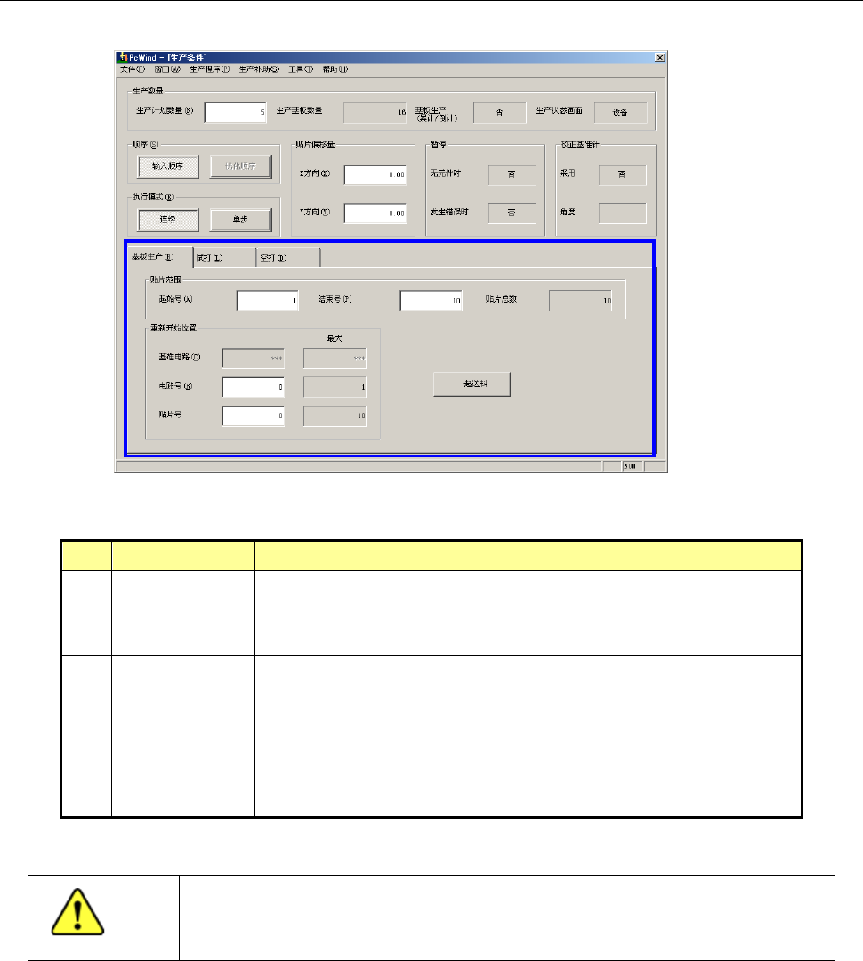 第 1 部 基本篇 第 2 章 生产 2- 41 2-8-2- 2 个别设定项目 (1) 基板生产 No. 项目 内容 1 贴片范围 需要限定贴片范 围时,输入开始 号和结束号。 在总贴片 点数项目中可显示每 1 电路的总贴片步骤号。 此项设置限于设定为输入顺序时。 2 重新开始位置 因某些原因生产 中断、基板被释 放的情况下需 要继续贴装剩余 元 件、完成基板贴 片时,可指定重 新开始位置。 此外,也可从特 定的位置进行贴 片。 本设…