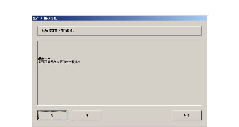 第 1 部 基本篇 第 2 章 生产 2- 58 2-8-3- 7 退出生产 在菜单栏中选择 [ 文件 ]-[ 退出 ] ,或单击 画面右上角的 。 显示如下信 息。 请单击 [ 是 ] 或 [ 否 ] 选择是否保 存生产程序 ( 含生 产管理信息 ) 。 退出生产画面后 ,会显示主画面 。