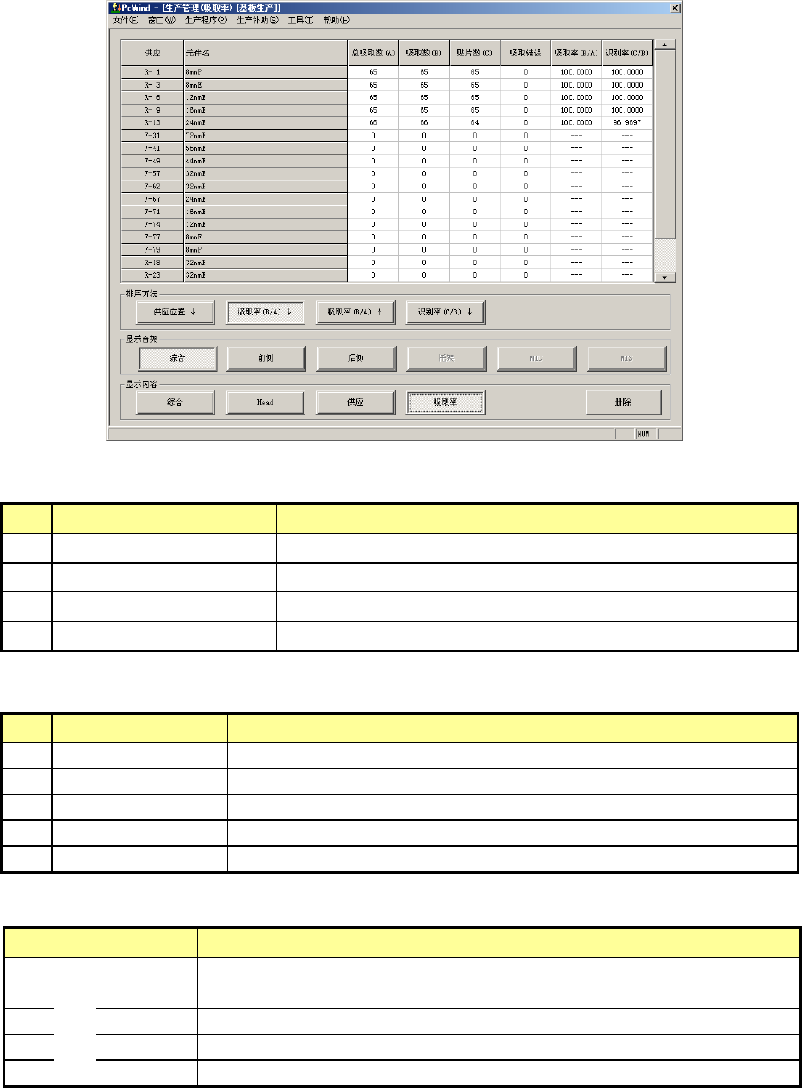第 1 部 基本篇 第 2 章 生产 2- 66 4) 生产管理信 息(吸取率) 显示 “ 各供给的吸取 率(吸取率 = 吸取数 / (吸取数 + 吸取错误数)) ” 。 ◇ 画面通常以 「 最差吸取率 」顺序显示。 排序方法:选择 列表排序方法。 No. 项目 内容 1 供给位置 ↓ 按供应位置的升 序显示。 2 吸取率( B/A ) ↓ 按吸取率的最差 顺序显示。 3 吸取率( B/A ) ↑ 按吸取率的最佳 顺序显示。 4 识别率…