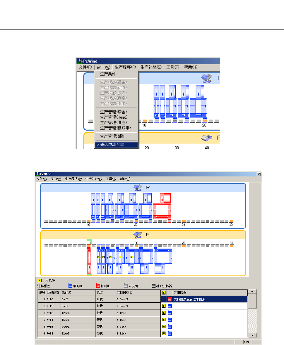 第 1 部 基本篇 第 2 章 生产 2- 68 2- 10 确认电动式供料器 本项中,对当前 生产程序之吸取 数据中的电动 式供料器,显示 元件错配检测 。 2- 10 - 1 电动式供料器确认画面 (1) 电动式供料器确认菜单 在菜单栏中点击 [ 窗口 ] 菜单, 选择 [ 确认电动台架 ] 。 (2) 内容
