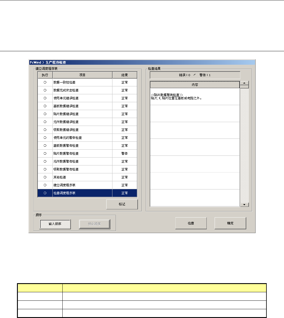 第 1 部 基本篇 第 2 章 生产 2- 88 生产程序的检查 项目为以下的列 表。 项目 内容 数据一致性检查 检查优化的一致 性。 数据完成状态检 查 检查基板数量、 贴片范围、各数 据的完成或连 接。 使用单元错误检 查 检查 Hea d 或贴片点标记 使用状况。 基板数据错误检 查 检查基准 面、传送方向或 BOC 标记的位置。 贴片数据错误检 查 检查 Hea d 或基准领域标 记的位置。 元件数据错误检 查 检查吸嘴、定心…
