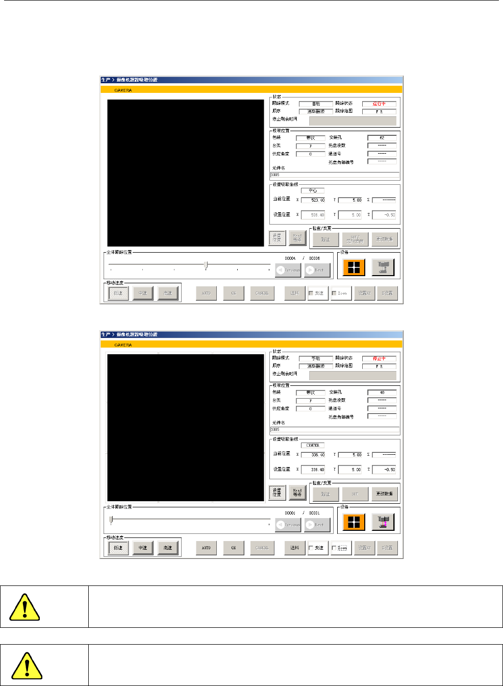 在打开吸取跟踪画面以前,为进行台架标记识别,轴将会移动。