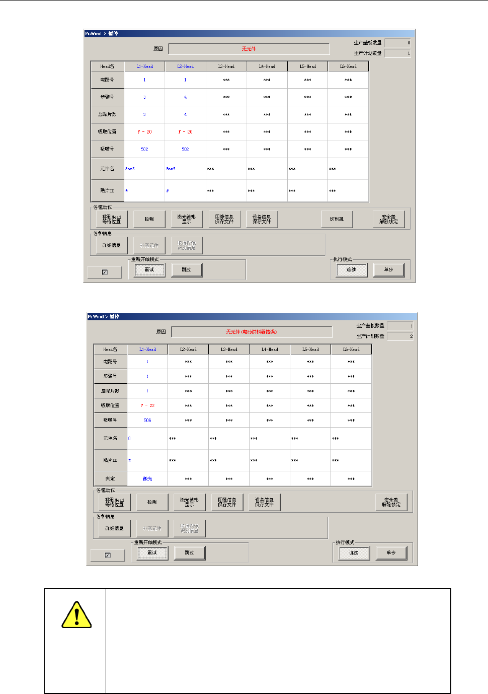 如果勾选了操作选项的[无元件暂停后,重新运行时跟踪吸取]选项,则在重新开始生产前,会显示设