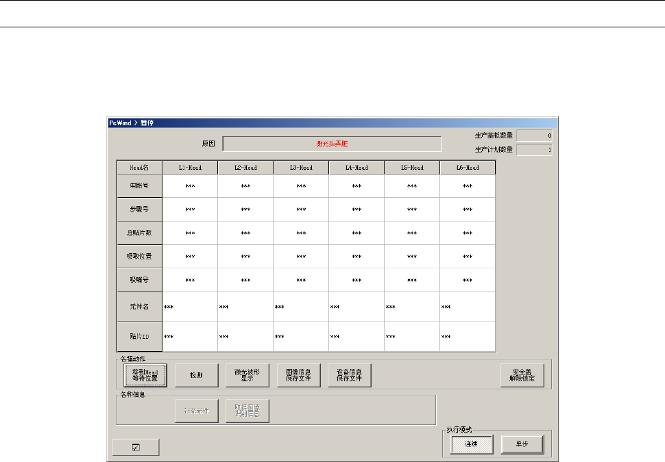 当暂停的原因为激光头弄脏错误、芯片站立错误、激光识别错误、异元件错误时,暂停画面上会显示