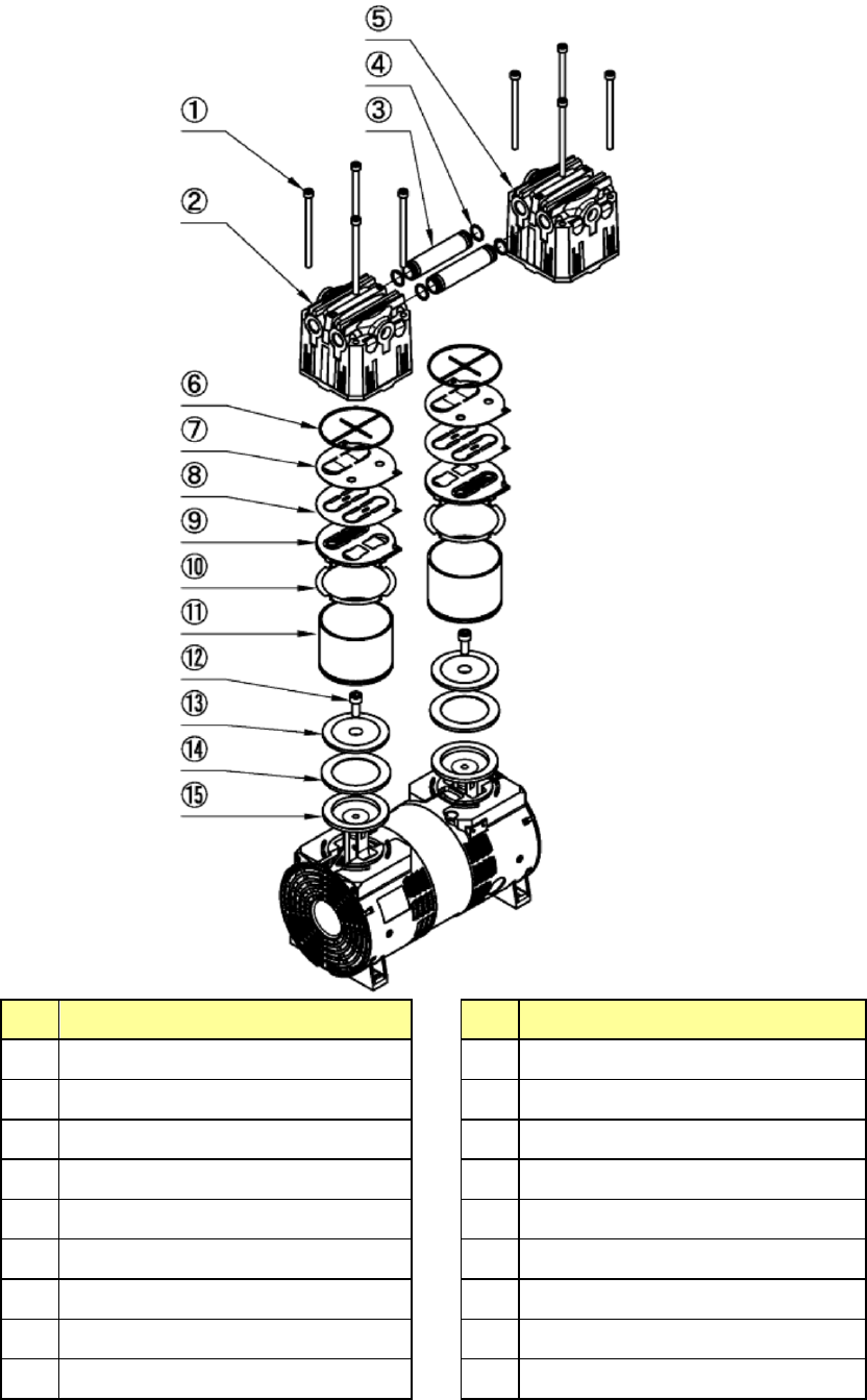 第 1 部 基本篇 第 3 章 维护 3- 46 ● 真空泵分解图 No. 名称 No. 名称 1 内六角螺栓( M 6×95 ) 8 根 10 气缸密封圈 2 泵头盖 1 11 气缸 3 连接管 12 内六角螺栓( M 8×20 ) 4 O环 P- 10 13 碗型密封圈压板 5 泵头盖 2 14 碗型密封圈 6 密封圈 15 连杆 7 阀挡板 8 吸排气阀 9 气缸板