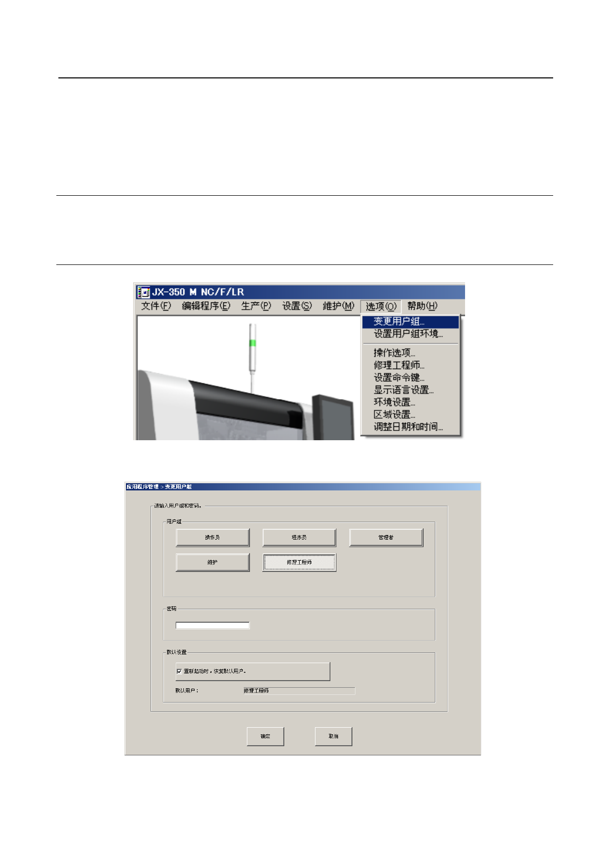 可修改用户级别变更时输入的密码,也可更改默认用户的设置(参见4-2-1-1 变更用户组的“重启