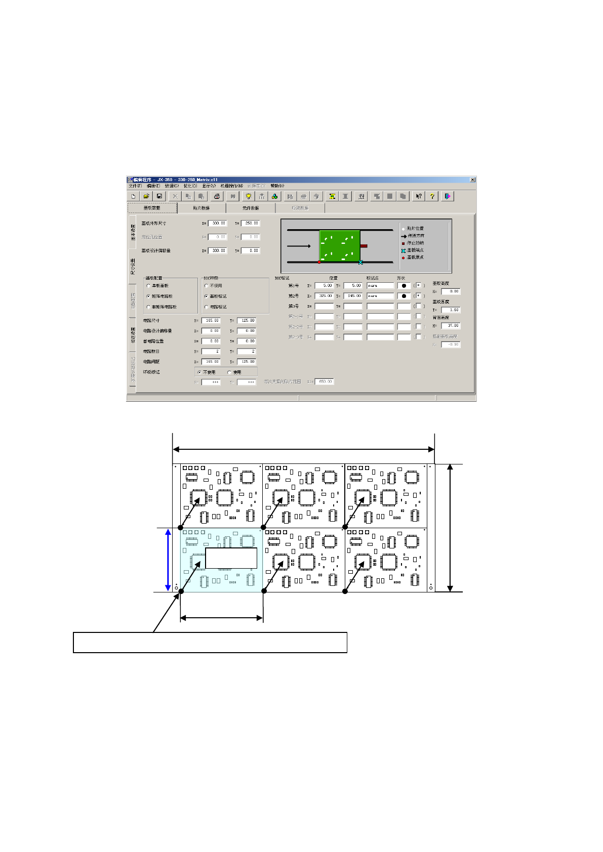 ②设置基板位置基准和电路原点,输入电路数和电路间距的信息。
