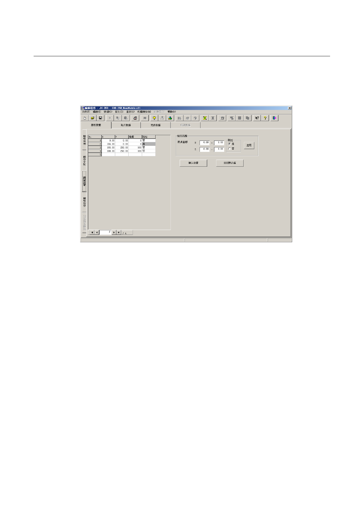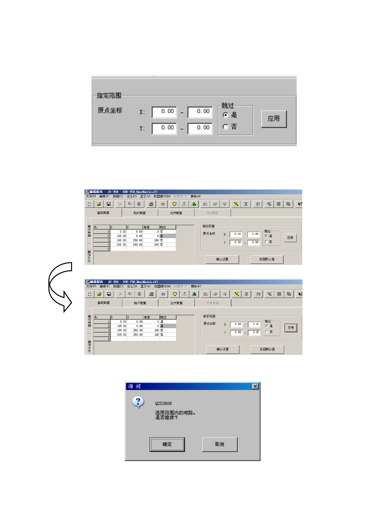 坐标范围,用单选按钮选择是否跳过后,按下「应用」按钮,即可设定范围内所有电路是否贴片。