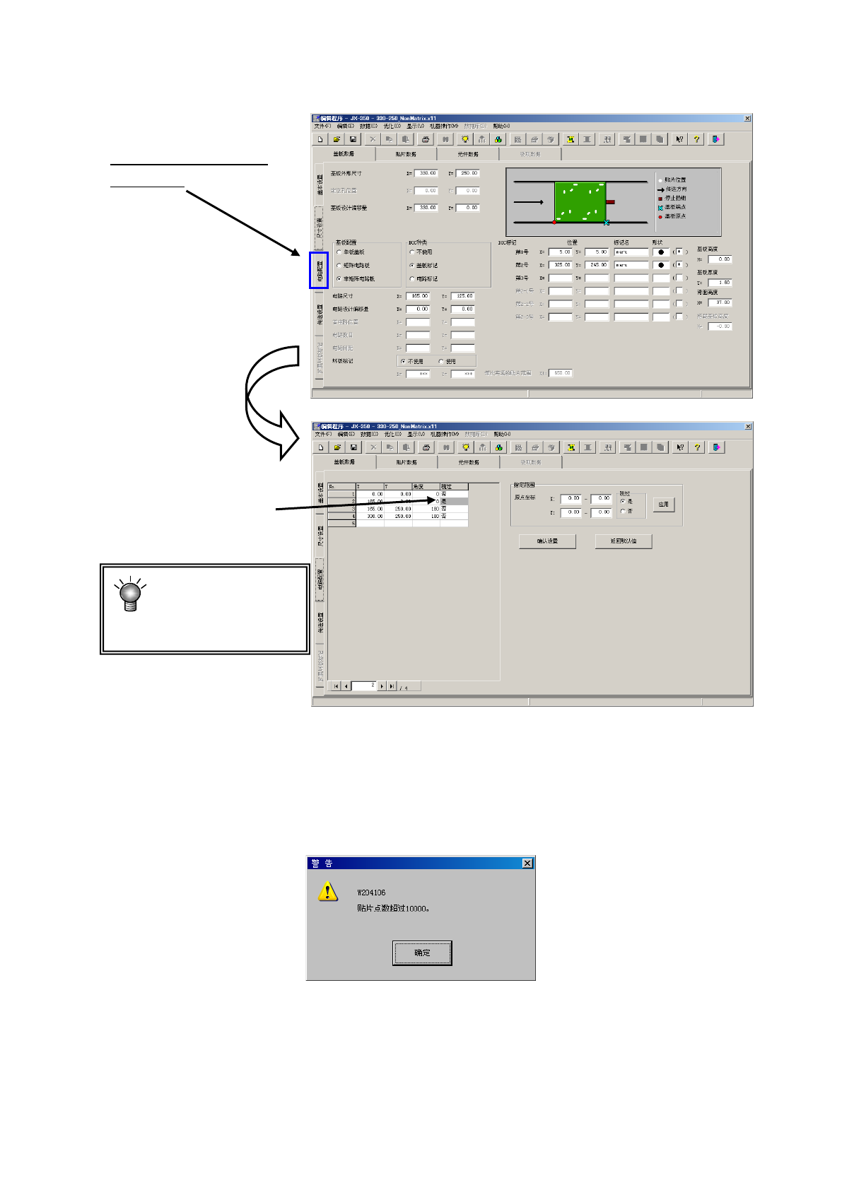 第 1 部 基本篇 第 4 章 制作生产程序 4- 33 必须输入至少 1 个电路配置的 坐标。 如果不进行输入 设置,将无法完 成数据。 如果在输入的过 程中转移到其他 页面,在该记 录中所输入的编 辑内容将丢失 。 即使电路数在规 定值以下,但是 当总贴片点数 超过 10, 000 点时,会显示如下 提示信息 。 选择后, 将 显示 「 电路配 置」 画面。 不进行贴片的电路跳 过 要设定为“ Yes (是) ”。 非矩阵电路板可制…