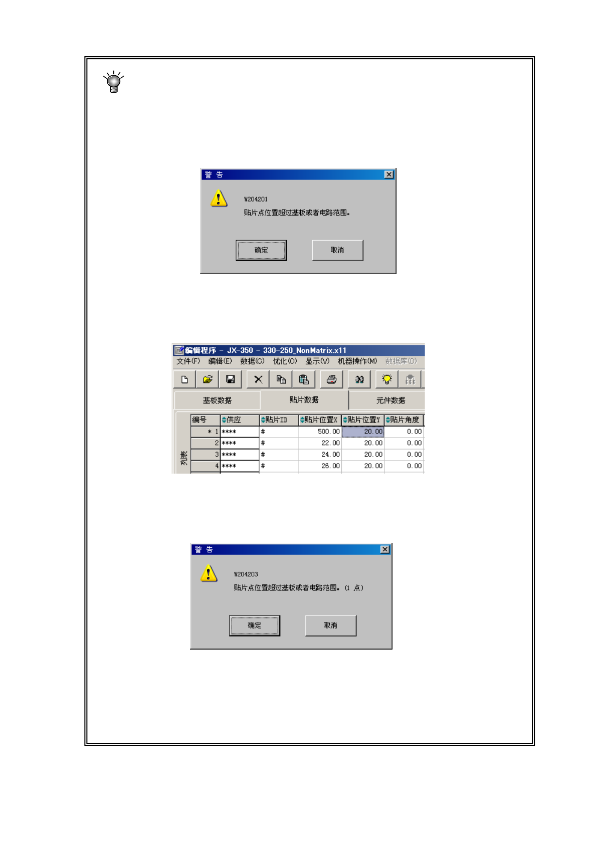 第 1 部 基本篇 第 4 章 制作生产程序 4- 50 范围检查 在下列时间段内,对贴片位置是否在基板内 ( 单板基板时 ) 、或是否在电路内 ( 多电路 板 时 ) 进行检查。 1) 输入数据时 在输入贴 片位置 X 或 Y 时,或分别进行了改变 时,将进行范围 检查。 出错时,将显示 如下的警告信息 。 ● 确定 => 确定输 入数据,在 贴片数据编号的 左侧显示超范围 标记 “*” ( 参见下图 ) 。 如果输入 范围内的…