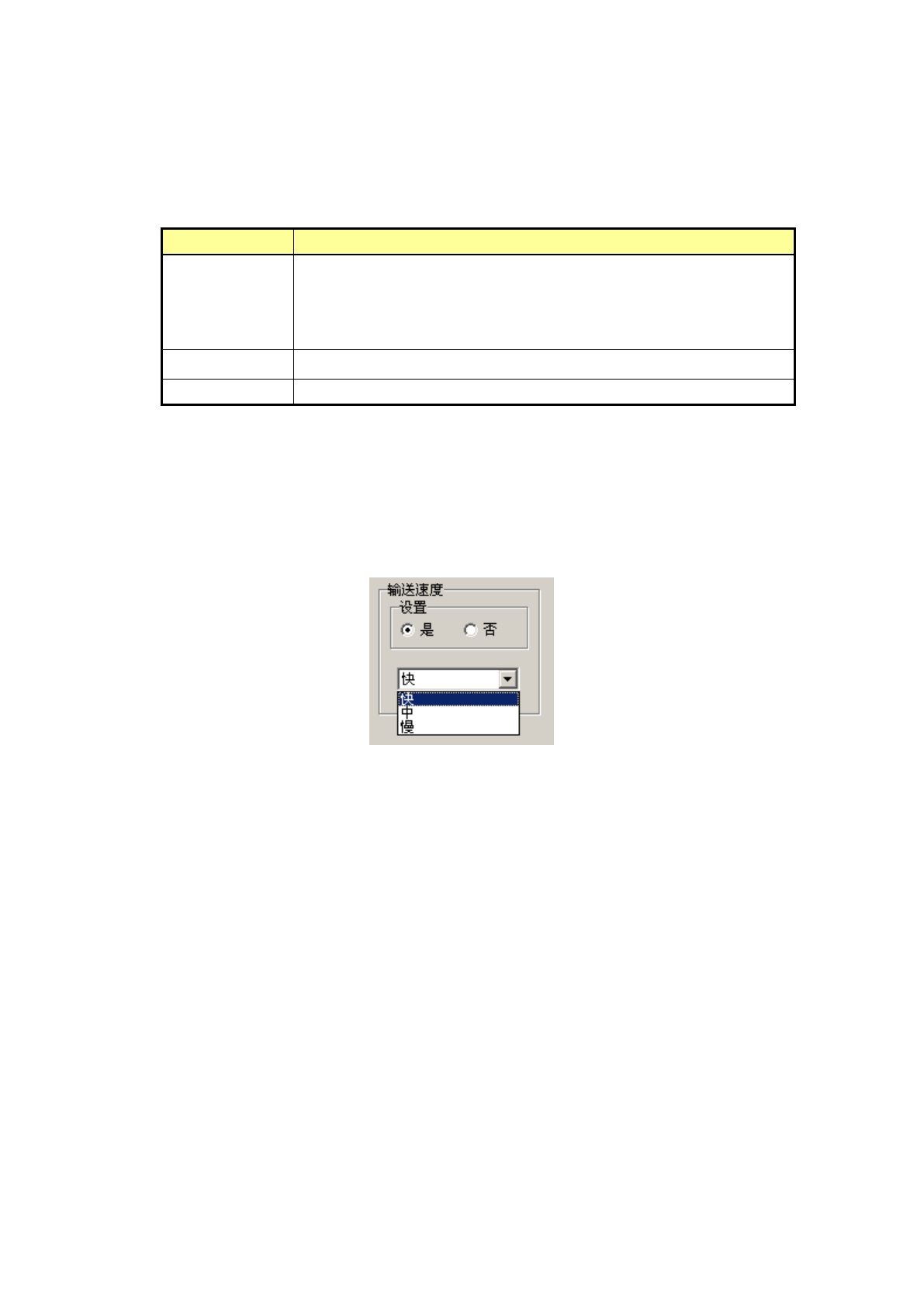 设置电动式供料器的间距输送速度。要变更输送速度时,设置选择“是”,从下拉列表中选择“高速”、