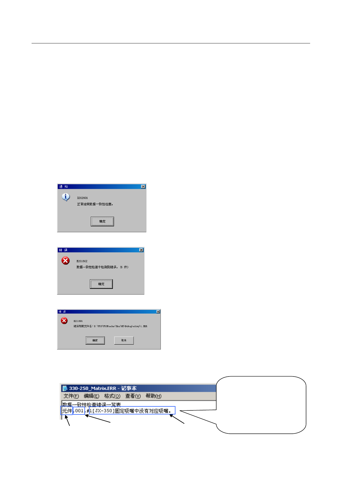 在电动供料器一致性检查中,检查出错误时,会显示以下提示信息。