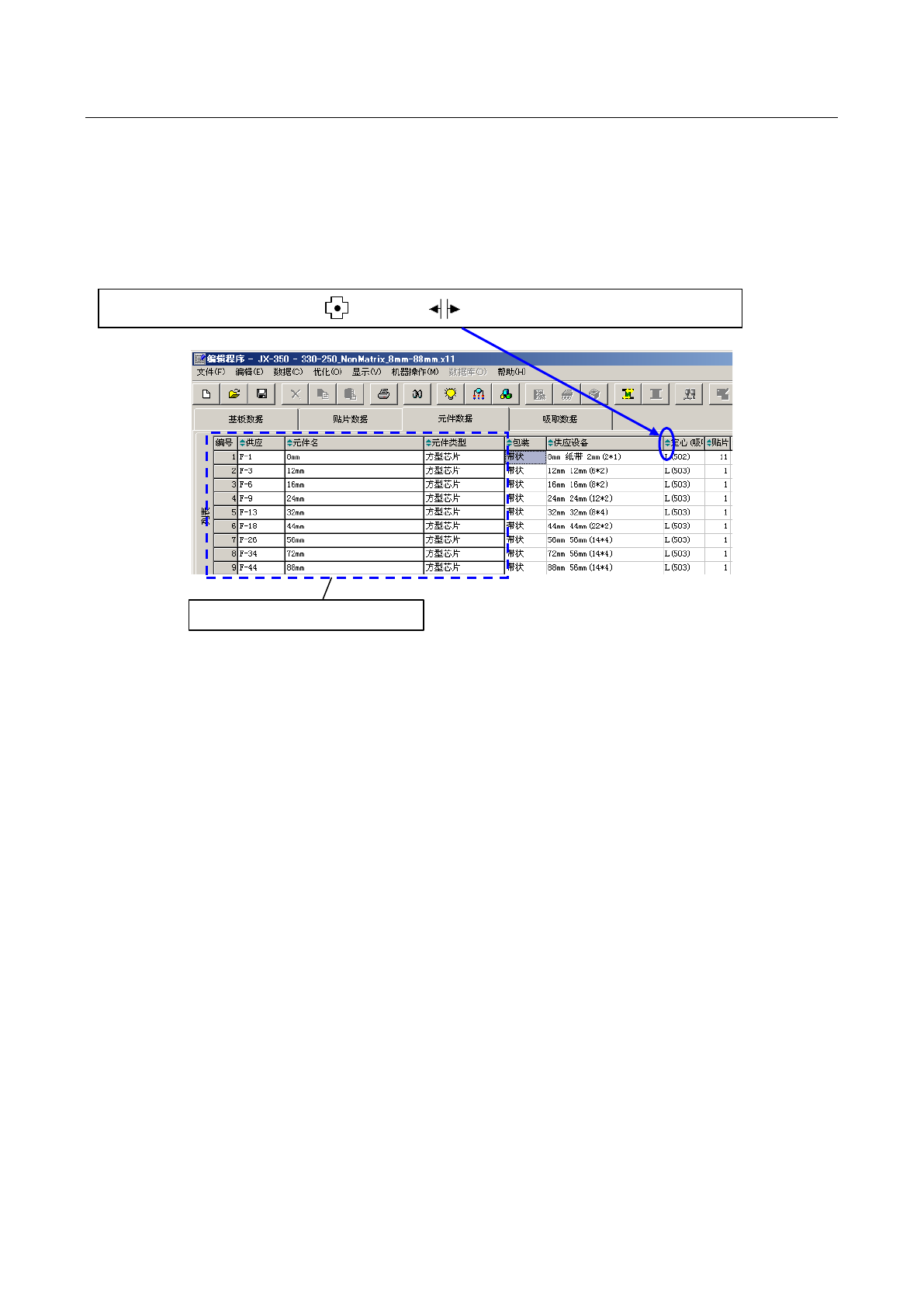 但是,在元件数据 列表画面上已标有元件名称、元件种类等的,即使画面滚动也固定显示的部分,