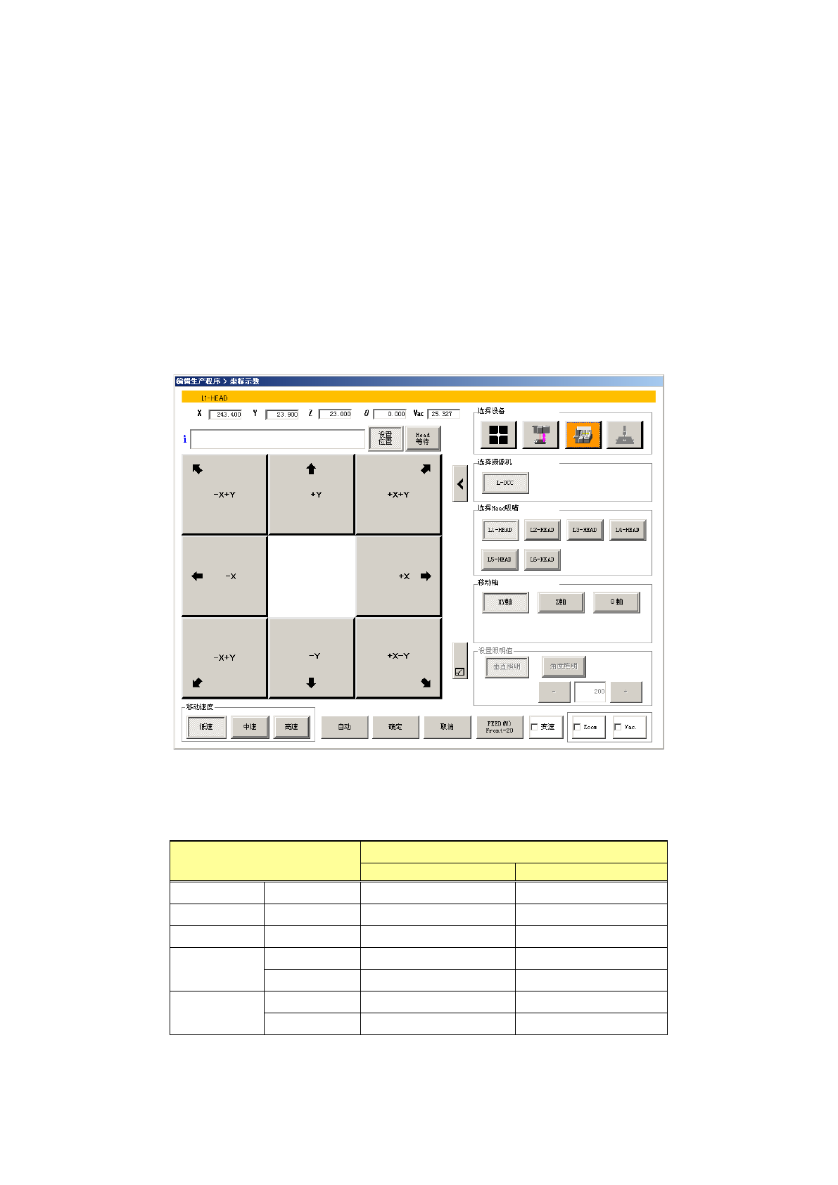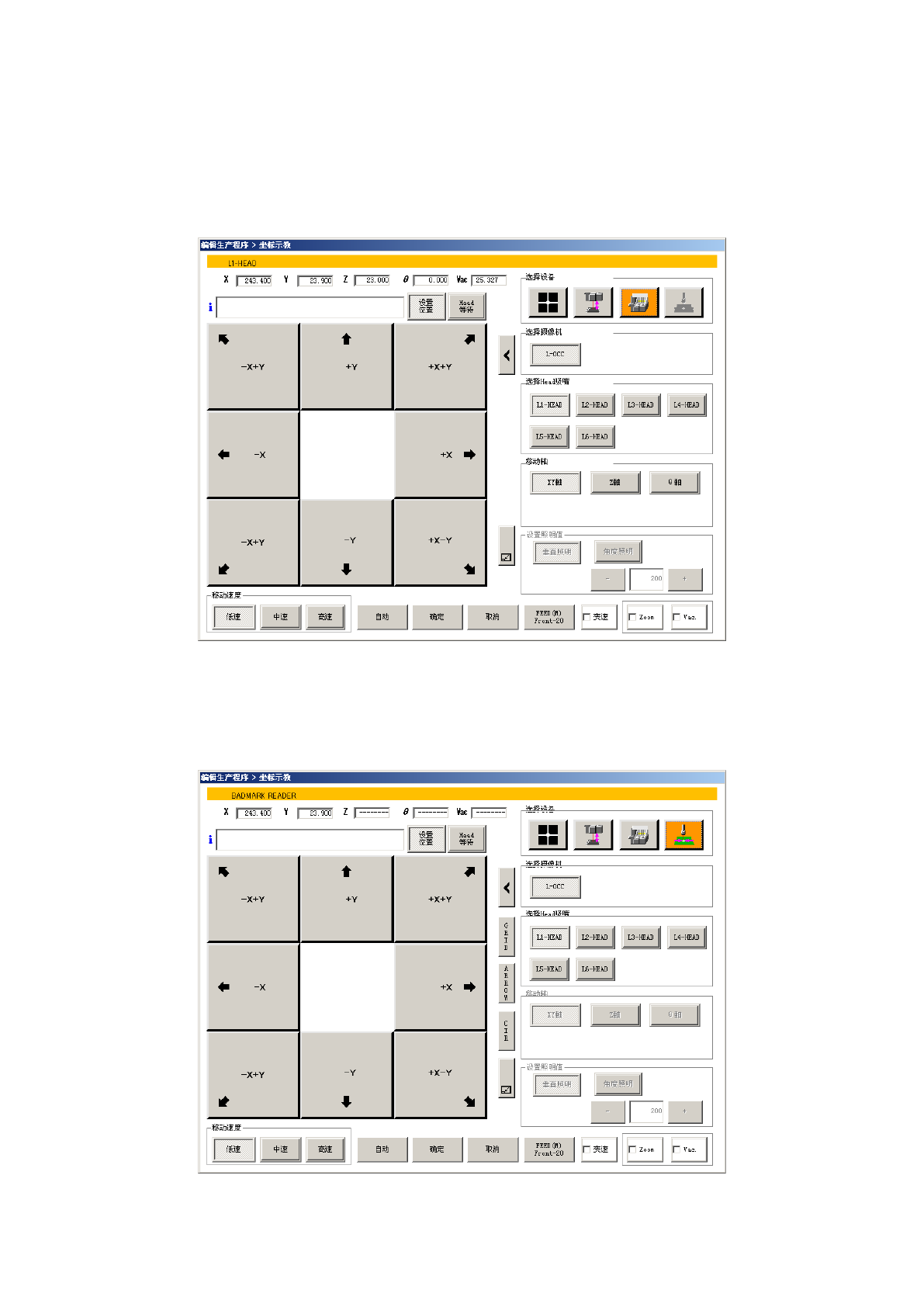 第 1 部 基本篇 第 4 章 制作生产程序 4- 148 ( 2) 使用 Head 的各吸嘴 进行示教的方法 在选择装置时, 选择了 Hea d 装置、或选择 Head ( Hea d )吸 嘴时选择各 HEAD 后, H ead 会移 动到当前显示的 坐标上。 1 )XY 轴移动 选择移动轴的 [XY 轴 ] 按钮,用 8 个方向按钮使 XY 轴移动。 在 X 、 Y 各自的文本框里会显 示出当前的 XY 坐标。 (3) 使用坏板标…