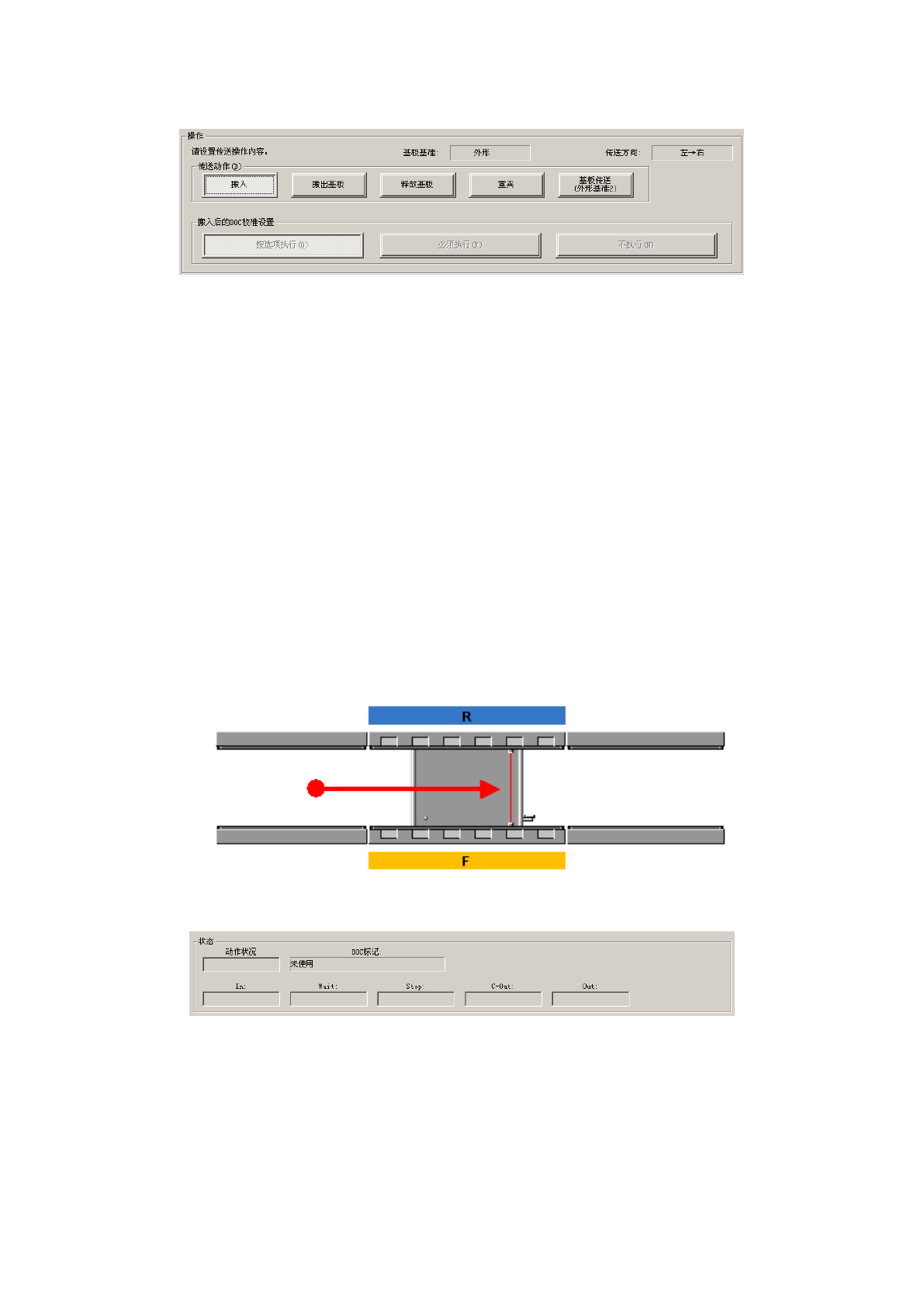 选择传送动作。可选择搬入、搬出基板、释放基板、重夹、基板传送(外形基准 2)。