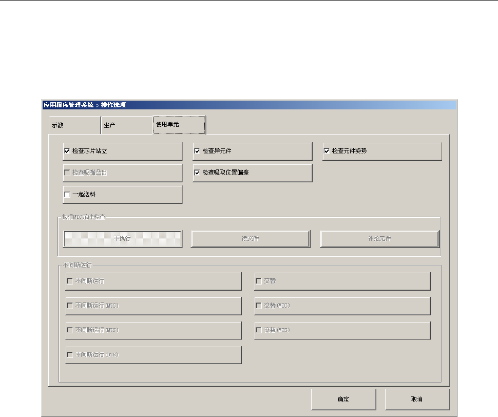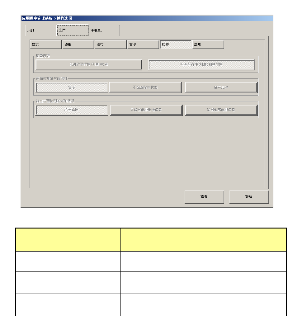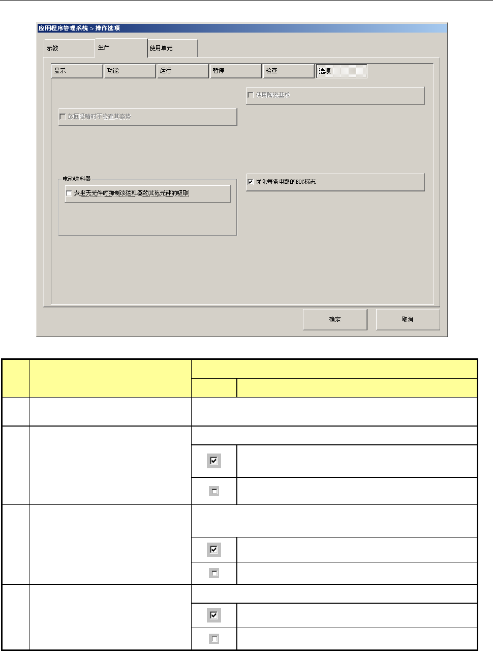 第 2 部 功能详解篇 第 6 章 操作选项 6- 18 6-3-6 选项 按下[选项]按 钮时,会显示 “ 生产时的 选项设置画面 ” 。 No. 项目 内容 状态 动作及详细 内容 1 使用陶瓷基板 不能 选择 。 2 放回吸嘴时不检 查其姿势 设置是否在放回 吸嘴时检查吸嘴 的姿势。 放回吸嘴时不检 查吸嘴的姿势。 检查 出异常时, 显 示 “ 吸嘴安装 状态异常 ” 。 放回吸嘴时检查 吸嘴的姿势。 3 发生无元件时抑 制该供料…