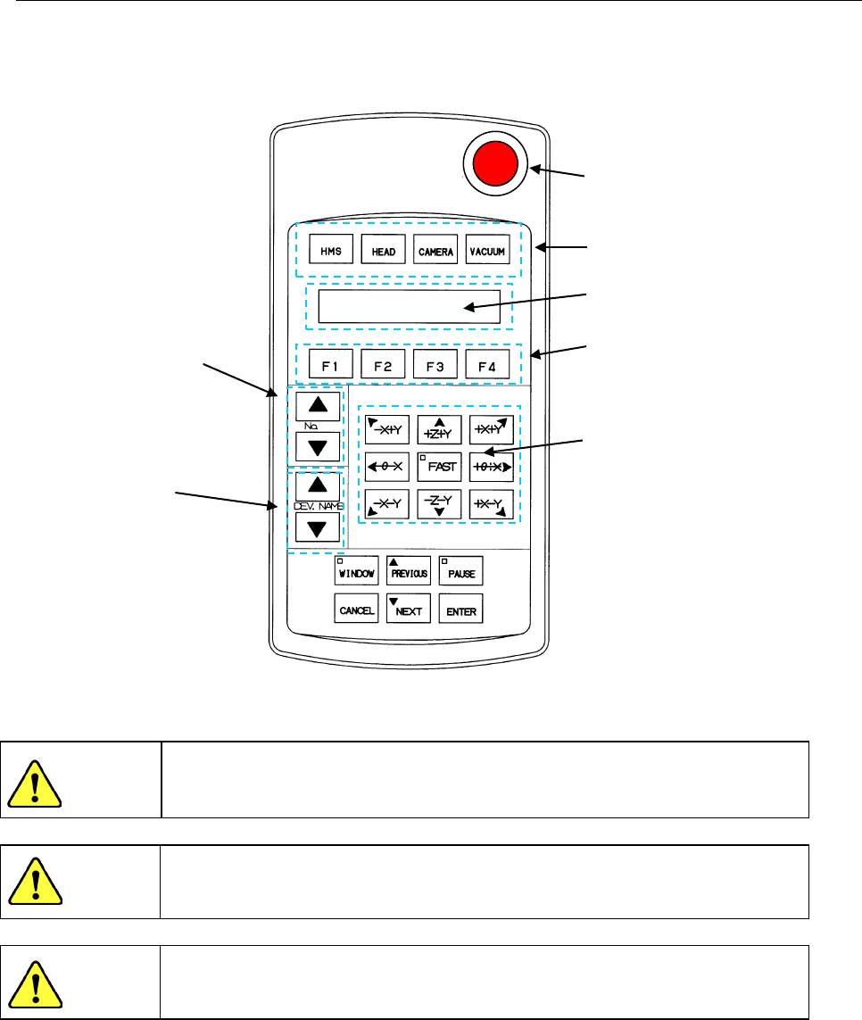 第 1 部 基本篇 第 1 章 装置概要 1- 46 HOD 键一 览表 键名 功 能 HMS ·通过高度传感器来获 得吸取高 度。 (选择后 LED 灯 亮 。) HEAD ·用 H ead 示教时使用。 (选择后 LED 灯 亮 。) CAMERA ·用 OC C 示 教时使用。 (选择后 LED 灯 亮 。) V ACUUM ·用于示教真空压。 (选择后 LED 灯 亮 。) F1 ·选择其他移动目标位 置、以及 指定示教点数等。…