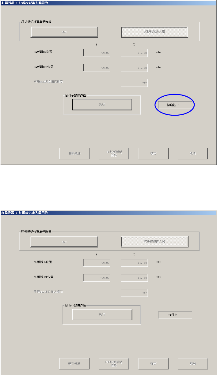 1) 选择执行后,会在下图的坏板标记读入器示教的自动示教临界值的状态里显示“初始化中”