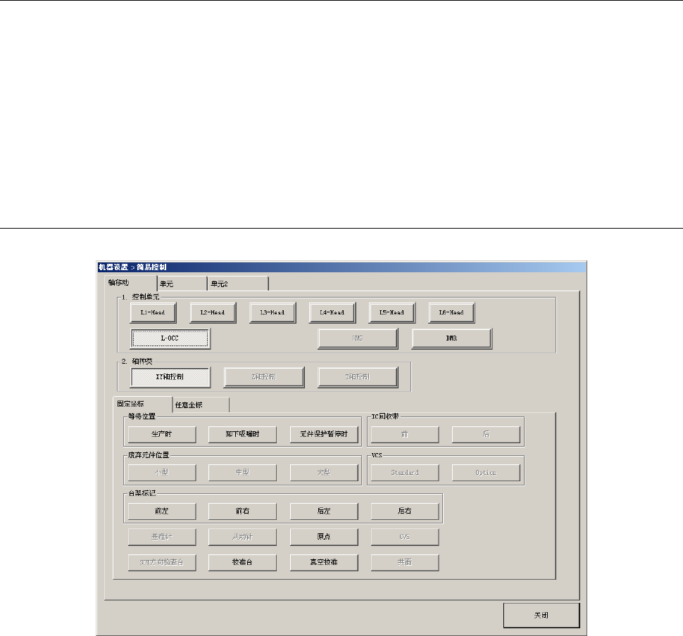 第 2 部 功能详解篇 第 7 章 机器设置 7- 57 7-5 简易控制 从机器设置、 手动控 制、 自动校准、 MS 参数功能栏中选择 「 简易 控制 」 后, 可打开如下的简易控 制主画面。 画面上设有「 轴移动 」 和 「单元 1 」 、 「 单元 2 」 选项卡。 按下 「轴移动 」 选项卡后,可用「 选择设备 」 按钮、 「 控制单元 」 按钮、 「轴种类 」 按钮,对指定 的控制单元进行 操作。 按下 「单元 1 」 选项…
