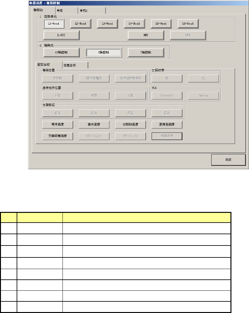 第 2 部 功能详解篇 第 7 章 机器设置 7- 60 (2) Z 轴控制 控制单元选择 [ Head ] 时,可移动 Z 轴。 ※ 当选择 [ 基准 面高度 ] 、 [ 交换吸嘴高 度 ] 按钮后,会 显示吸嘴降低提 示信息。 ·Z 轴控制 ( 控制单元: H ead -L1 ~ L6) No. 移动位置项目 详细项目 1 等待高度 指定的 He ad 移 至激光高度元件 上方 + 0. 5mm 的位置。 2 激光高度 指定的 He…