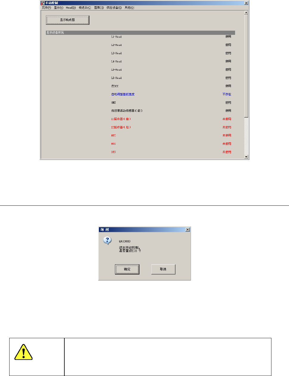 第 2 部 功能详解篇 第 8 章 手动控制 8-3 点击 [ 显示构成图 ] 按钮,或选择菜单栏的「显示」 → 「显示构成图」 ,即可 返回到初始画面 (构成 图 )。 8-2-2 退出手动控制 依次点击菜单栏 中的 [ 文件 ] -[ 退出 ] , 或按下画面右上方 的关闭按钮[ × ] ,或按下工具栏中的退出 按钮, 可退出手动控制 。 「确定」 :执行 I/O 安全方向设置后退出。例如, Hea d 带有吸嘴时,将吸嘴放 回 A…