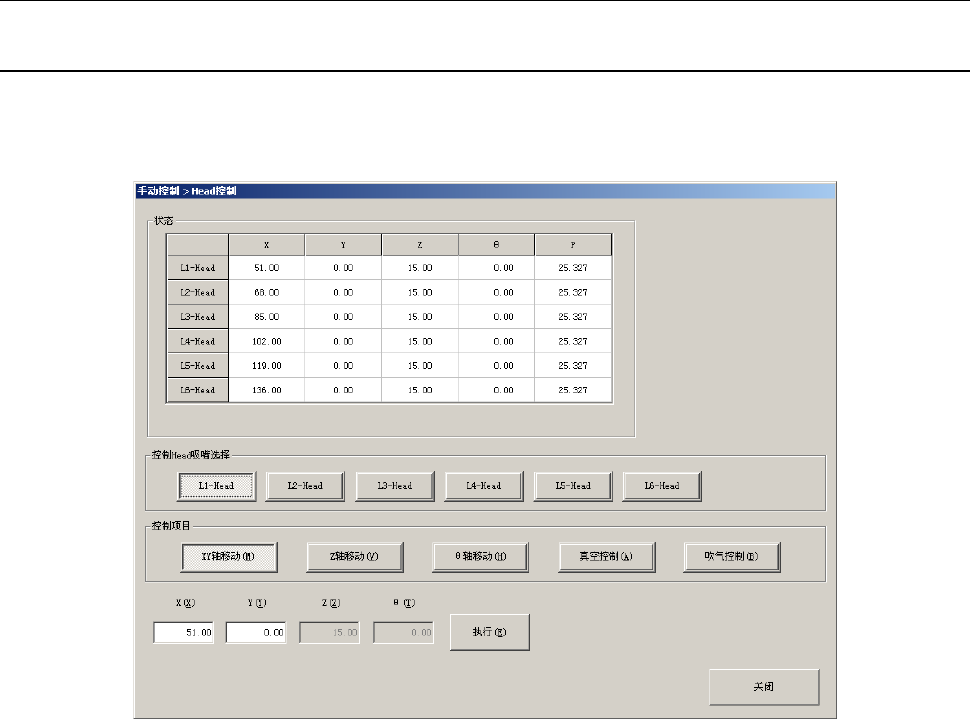 第 2 部 功能详解篇 第 8 章 手动控制 8-8 8-4 Head 8-4-1 Head 控制 点击下拉菜单中 的 [ Head( D) ]-[ Head 控制 (H ) ] , 或选择 命令按钮中 的 [ Head 控制 ] 后, 可显示 H ead 控制 画面。 (1) 控制 Hea d 吸嘴选择 用单选按 钮选择控制对象 H ead 。 不受机器设置的 “ 使用单元 ” 设置的影响。
