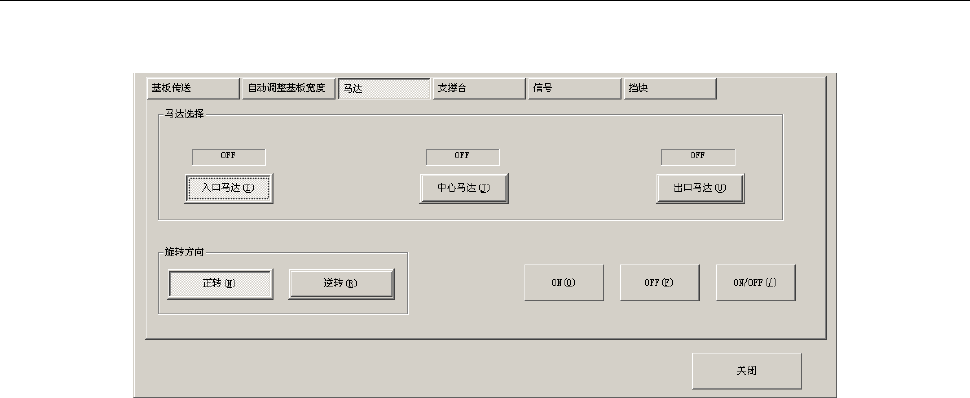 第 2 部 功能详解篇 第 8 章 手动控制 8- 31 8-5-1-3 控制对象:马达 按下 [ 马达 ] 按钮后,会显 示如下画面。 (1) 马达选择 选择各种控制马 达。 (2 ) 旋转方向 选择马达的旋转 方向。 (3 ) ON/O FF 按钮 控制所选 择的传送马达的 ON / O FF 。 选择 [ON ( O ) ] 按钮、 [O FF ( F ) ] 按钮、 [ON/O FF ( / ) ] 按钮,或按 [F3] 键、 …