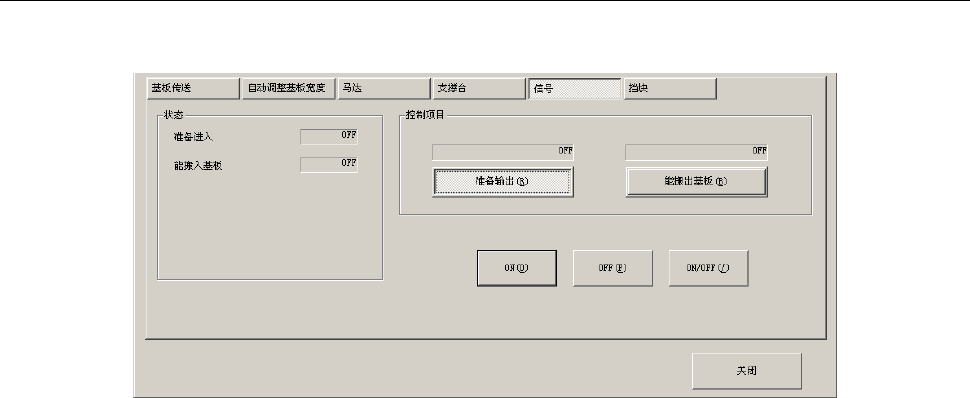 第 2 部 功能详解篇 第 8 章 手动控制 8- 33 8-5-1-5 控制对象:信号 按下 [ 信号 ] 按钮,会显 示如下画面。 (1) 状态 显示传感器的状 态。 (2 ) 控制项目 选择准备输出、 或能搬出基板。 (3 ) [ ON ]/[O FF ] /[ ON/O FF ] 按钮 对 所选择的控 制项目信号, 进行 ON 、 O FF 控制。 也可使用 [F 3] 键、 [F4] 键、 [F5] 键。