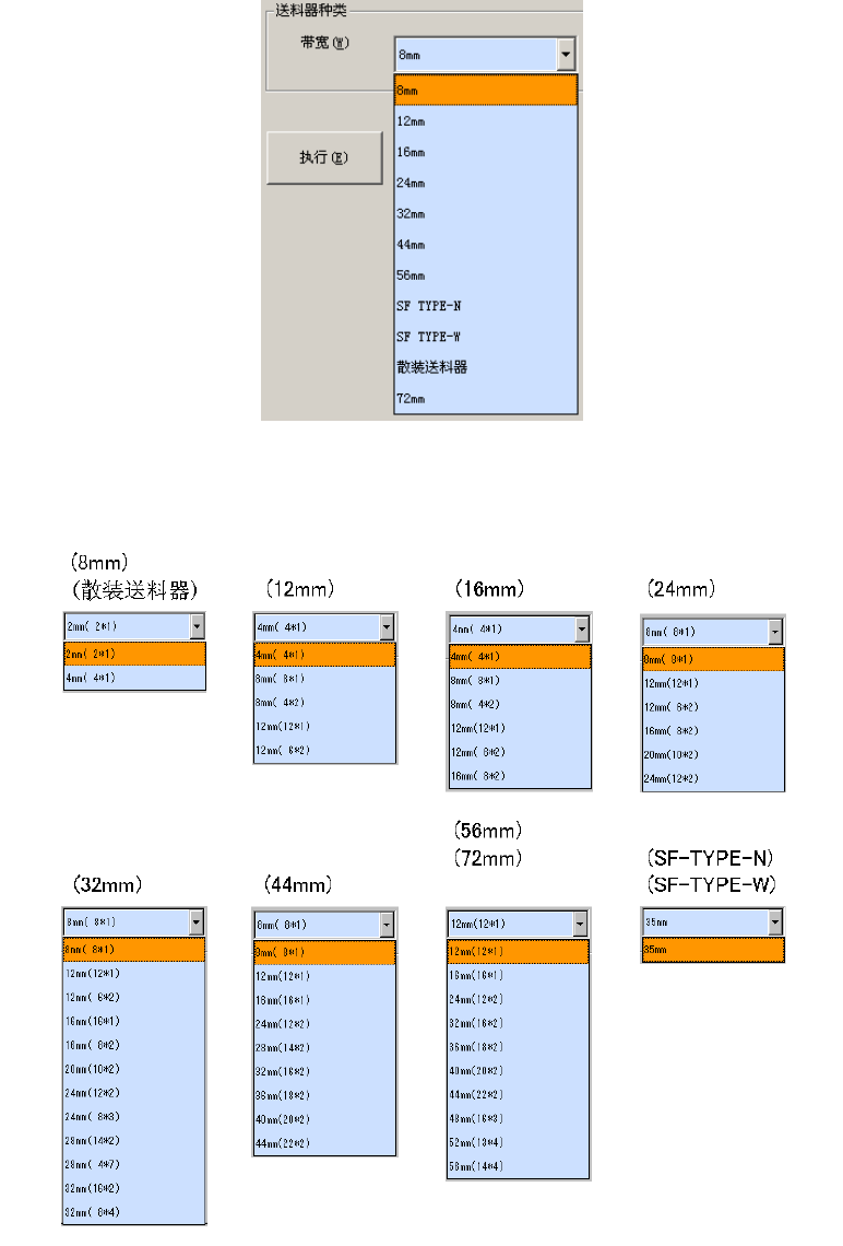 单击组合框、或在光标对准组合框的状态下,按 [Alt ]+ [↓]键选择供料器类型。在控制项目中设