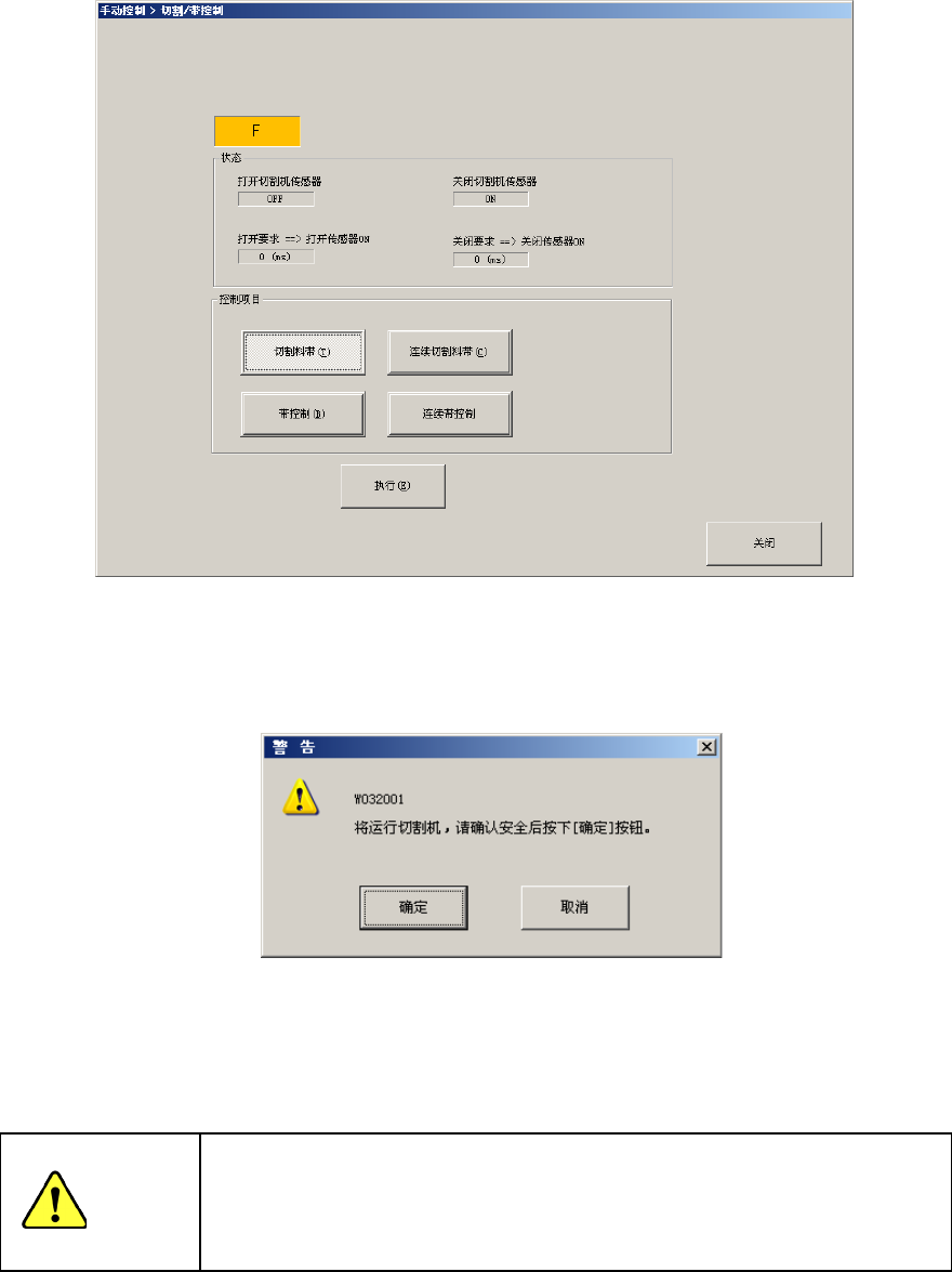 第 2 部 功能详解篇 第 8 章 手动控制 8- 45 (6) 切割 / 带 控制 连接电动式台架 后, [ 切割控制 ] 按钮变为有 效。按下 [ 切割控制 ] 按钮 ,即可显示切割 控制画面。 用控制项目的单 选按钮( [ 切割料带 ] 、 [ 连续切割料带 ] 、 [ 带 控制 ] 、 [ 连续带 控制 ] )选择动作, 按下 [ 执行 ] 按钮。按 下 [ 执行 ] 按钮后,会显示提示 ,按下 [ 确定 ] 按钮后即开始运行 …