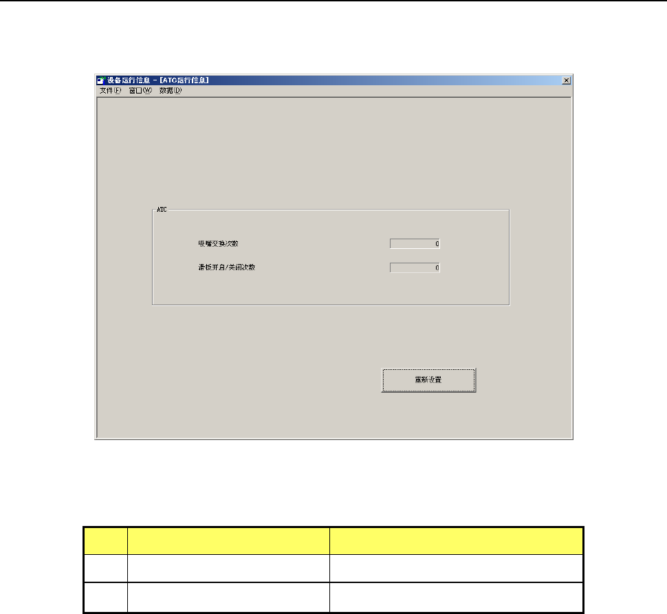 第 2 部 功能详解篇 第 9 章 设备运行信息 9- 29 9-4- 11 ATC 运行信息 从下拉菜单中点 击 [ 窗口 (W ) ] -[ AT C 运行信息 ] , 或从命令 按钮中点击 [ AT C 运 行信息 ] 后, 可显示 AT C 运行信息画面。 (1) AT C No. 项目 内容 1 吸 嘴交换次数 各气缸交换 吸嘴次数的累 计。 2 滑板开启/关闭 次数 滑板开启关闭次 数的累计。