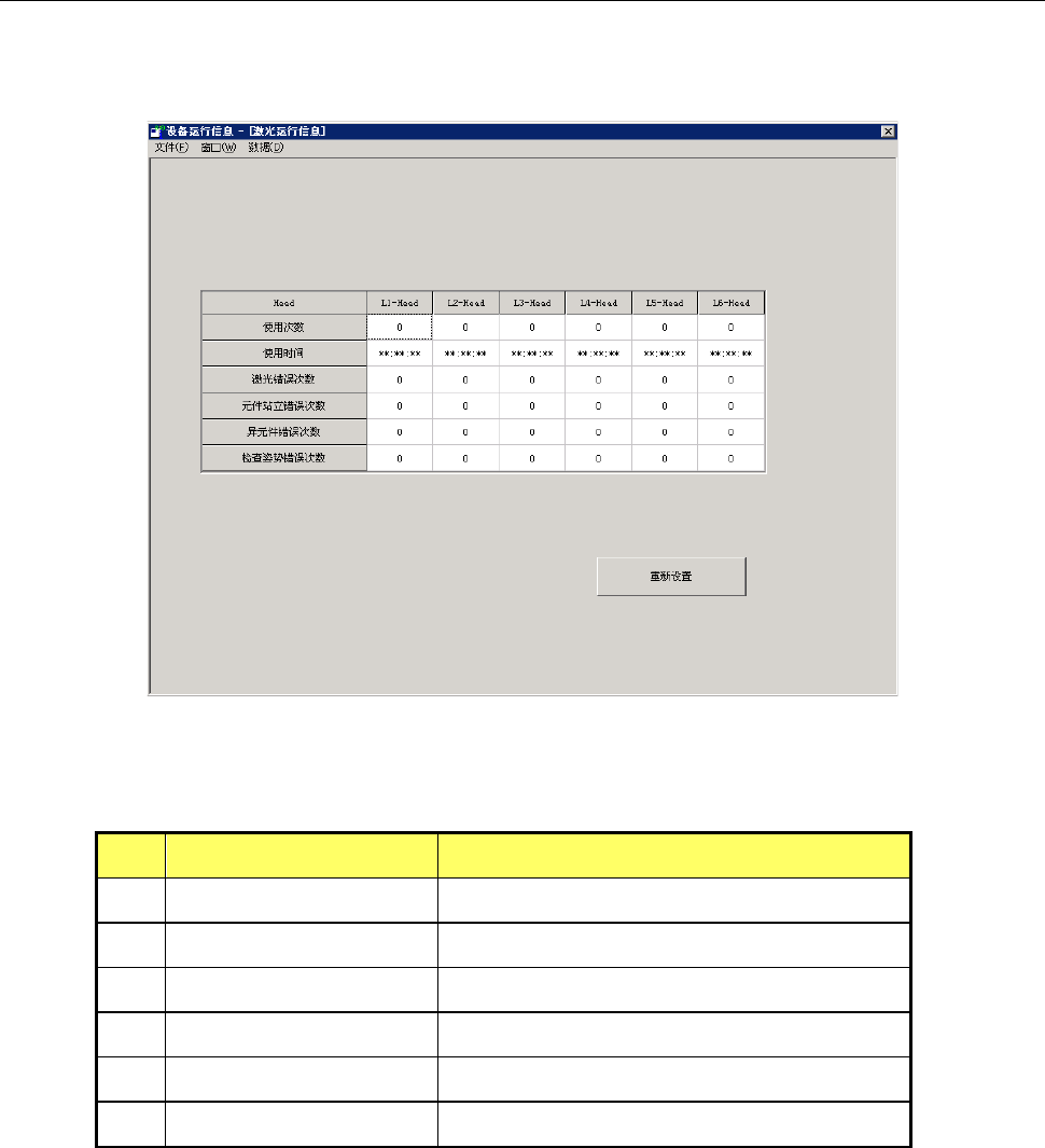 第 2 部 功能详解篇 第 9 章 设备运行信息 9- 32 9-4- 13 激光运行信息 从下拉菜单中点击 [ 窗口 (W )] -[ 激 光运行信息 ] ,或从命令按钮中选择 [ 激光运行信息 ] 后,可显示激光 运行信息画面。 (1) 激光运行信息 No. 项目 内容 1 使用次数 使用激 光的次数累计 。 2 使用时间 使用激光的时间 累计。 3 激光错误次数 发生激光错误的 次数累计。 4 元件站立错误次 数 发生芯 片站立错…