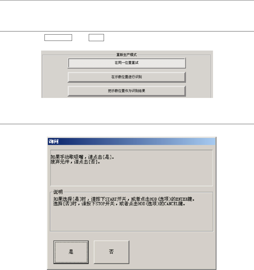 可用 HOD 的 PREVIOUS 键或 NEXT 键对编辑或生产时标记识别对话框的“重新开始模式”的单选按