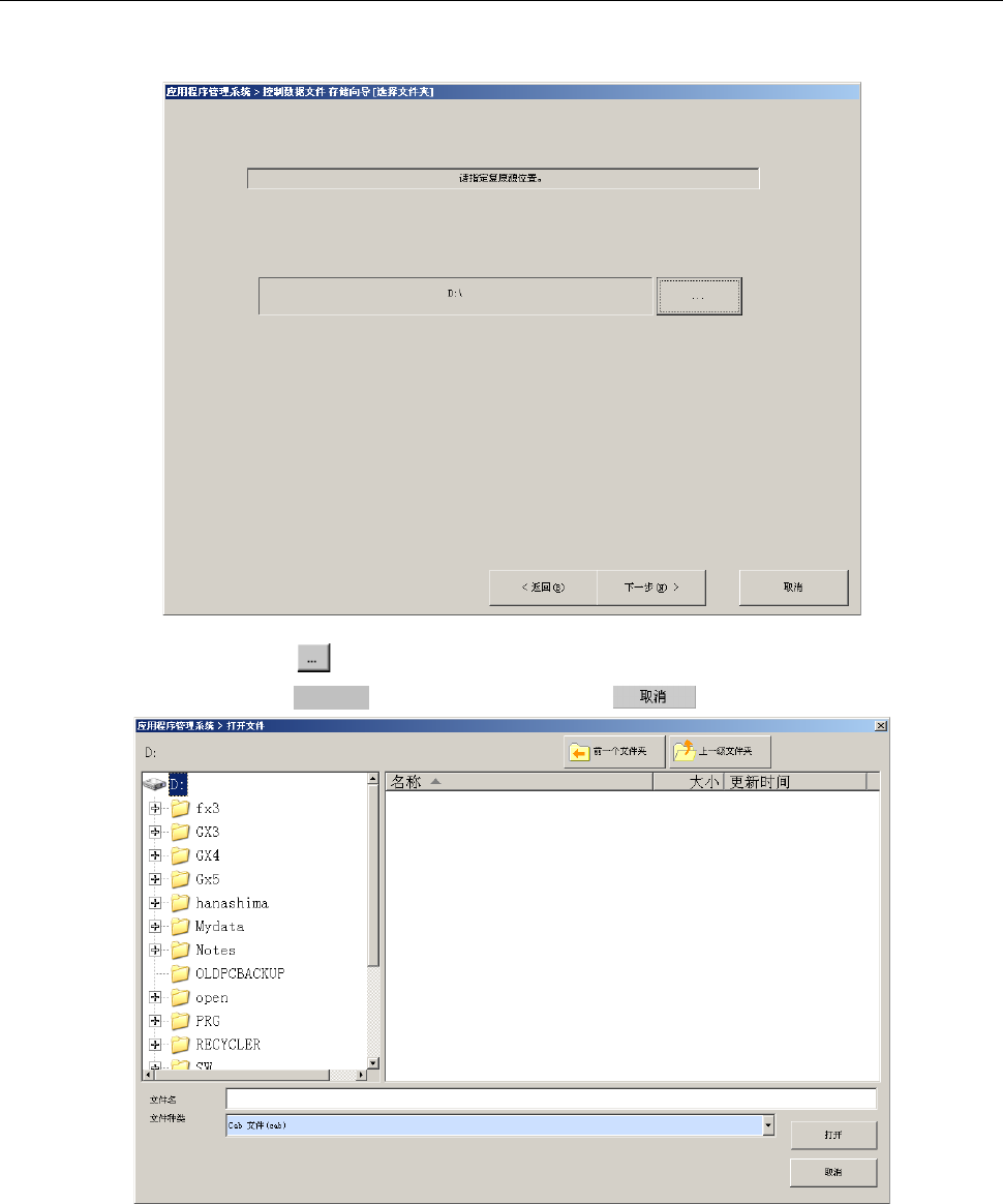 第 2 部 功能详解篇 第 13 章 程序补充 13 - 16 指定复原文件位 置后,按 按钮,显示如下 对话框画面。 ( 下例为从 USB 存储器复原文 件 ) 选择复原文件位 置中所显示的可 复原文件后, 请按下 按钮。 要变更操作内容 时按 按钮。 要结束作业时请 按 按钮。 按 按钮来保存 控制数据。 <返回( B )