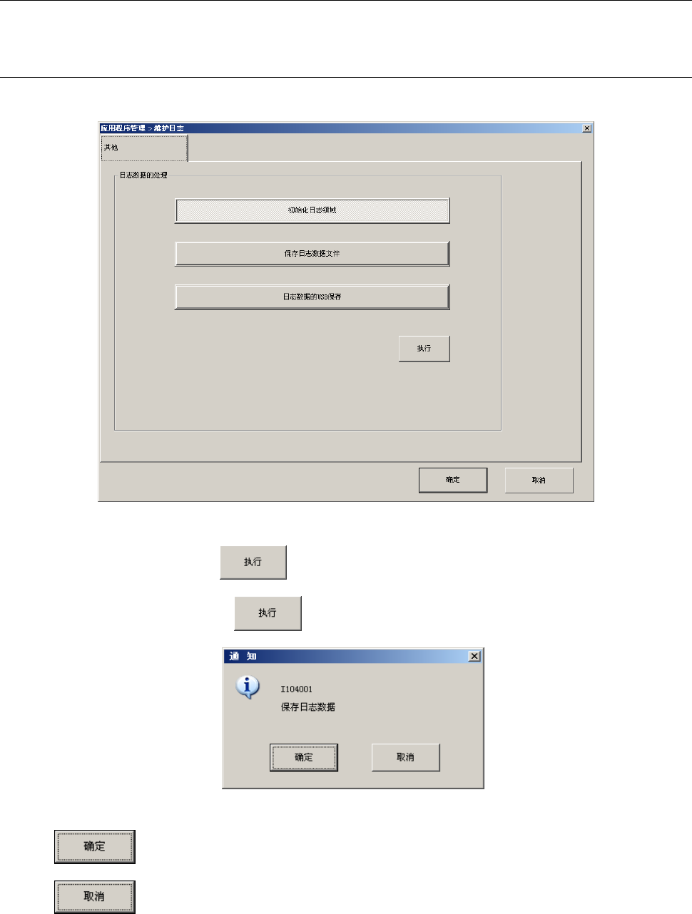 第 2 部 功能详解篇 第 13 章 程序补充 13 - 24 13 -7- 2 取得维护日志 取得维护日志( 操作日志 / 事件日志) 从 [ 维护 ] 菜单打开 [ 维护日志 ] 。 13 -7-2- 1 [ 其它 ] 选项卡 进行日志的初始 化及文件保存。 选择[初始化日 志领域]点击 ,则清除至 今为止的日志 的内容。 选择[保存日志 数据文件]点击 ,则显示确认信 息框。 点击 则保存。 点击 则不保存并返回。 保存结束则显示…