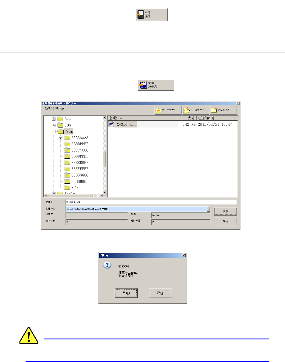 第 1 部 基本篇 第 1 章 装置概要 1- 79 1-9- 3 保存 保存已制作的生 产程序。 选择「文件」 / 「保存」 , 或按命令按 钮 , 即可执行保存命令。 1-9- 4 另存为 将编辑后的生产 程序保存于其他 文件夹、或更 改文件名保存时 , 选择 「 另存为 」。 < 步骤 > ① 选择 「 文件 」 / 「 另存为 」 , 或按命令按钮 。 ② 在“另存为” 画面上指定文件夹 和文件名后 , 单击 「 保…