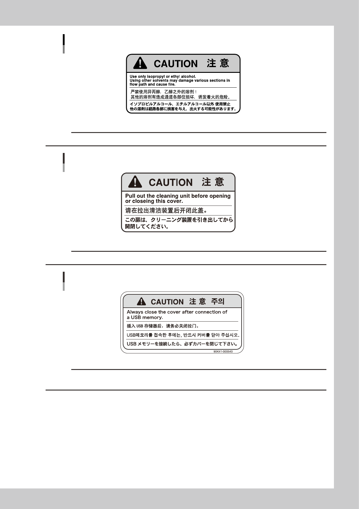 ix Before using the machine Do not use any solvent other than specified 23 0 0 1 - G 0 -2 L c CAUTION Using other than the specified solvents might damage the machine or create a fire hazard. Pull out the cleaning unit bef…