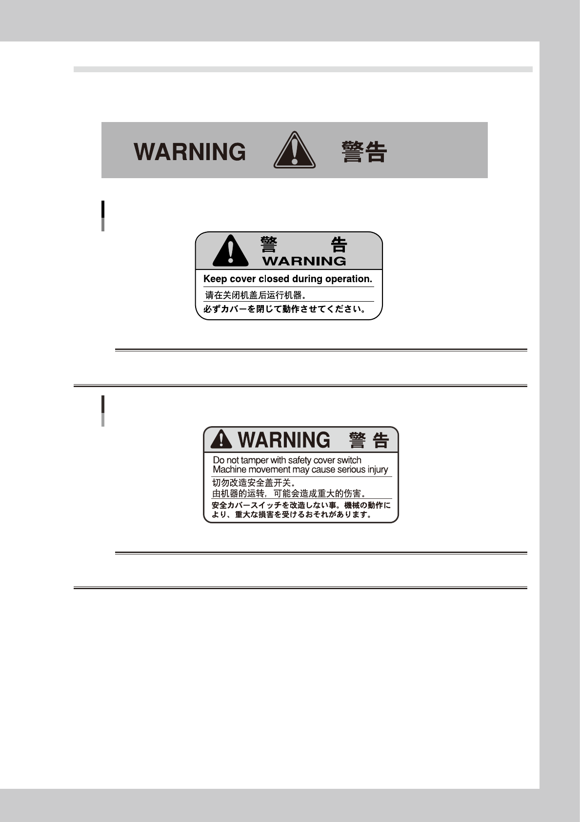 KEEP THE SAFETY COVER CLOSED DURING MACHINE OPERATION. INJURIES MIGHT OCCUR FROM TOUCHING MOVING