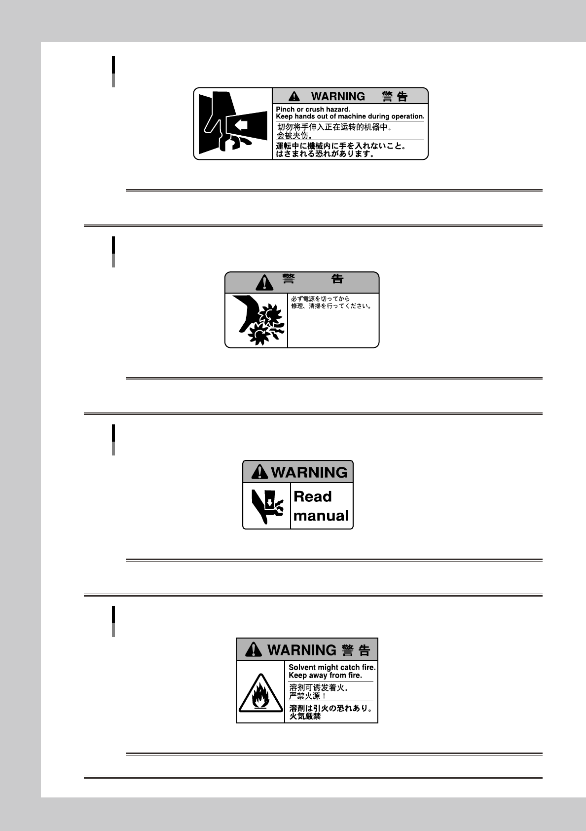 v Before using the machine 1 . 3 Wa r n i n g l a b e l s Th e f o l l o w i n g w a r n i n g l a b e l s a r e a f f i x e d t o t h e m a c h i n e s . C h e c k t h e i n f o r m a t i o n o n t h e l a b e l a n d a…