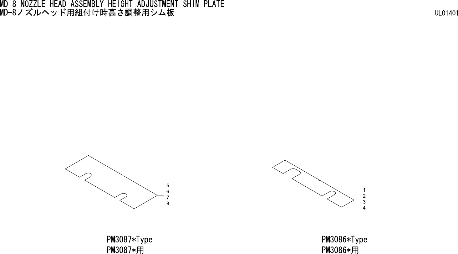 MD-8 NOZZLE HEAD ASSEMBLY HEIGHT ADJUSTMENT SHIM PLATE MD-8 ノズルヘッド用組付け時高さ調整用シム板 UL01401 No. Drg.No. & Code No. QTY Description Rating Materials Remark 番号 図番 & コード番号 個数 品名 規格 材質 備考 1 PB17492 1 SHIM シム FE t=0.2 2 …