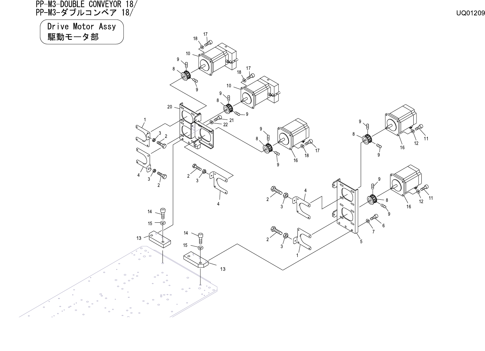 PP-M3-DOUBLE CONVEYOR 18/ PP-M3- ダブルコンベア 18/ UQ01209 No. Drg.No. & Code No. QTY Description Rating Materials Remark 番号 図番 & コード番号 個数 品名 規格 材質 備考 1 PP00940 2 BKT, ADJUSTING BKT セリ FE 2 H5172T 5 BOLT, HEX ボルト 六角 M…