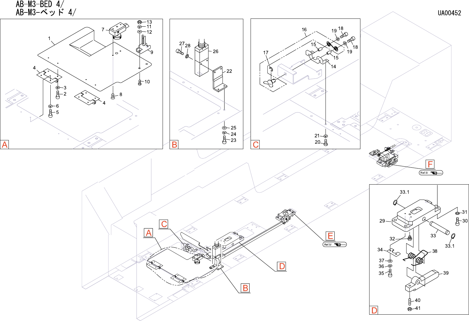 AB-M3-BED 4/ AB-M3- ベッド 4/ UA00452 No. Drg.No. & Code No. QTY Description Rating Materials Remark 番号 図番 & コード番号 個数 品名 規格 材質 備考 1 PB12681 1 COVER, LOWER カバー 下 FE 2 H5273A 4 BOLT, HEX SOCKET ボルト 六角穴 M03X005 FE 3 W…