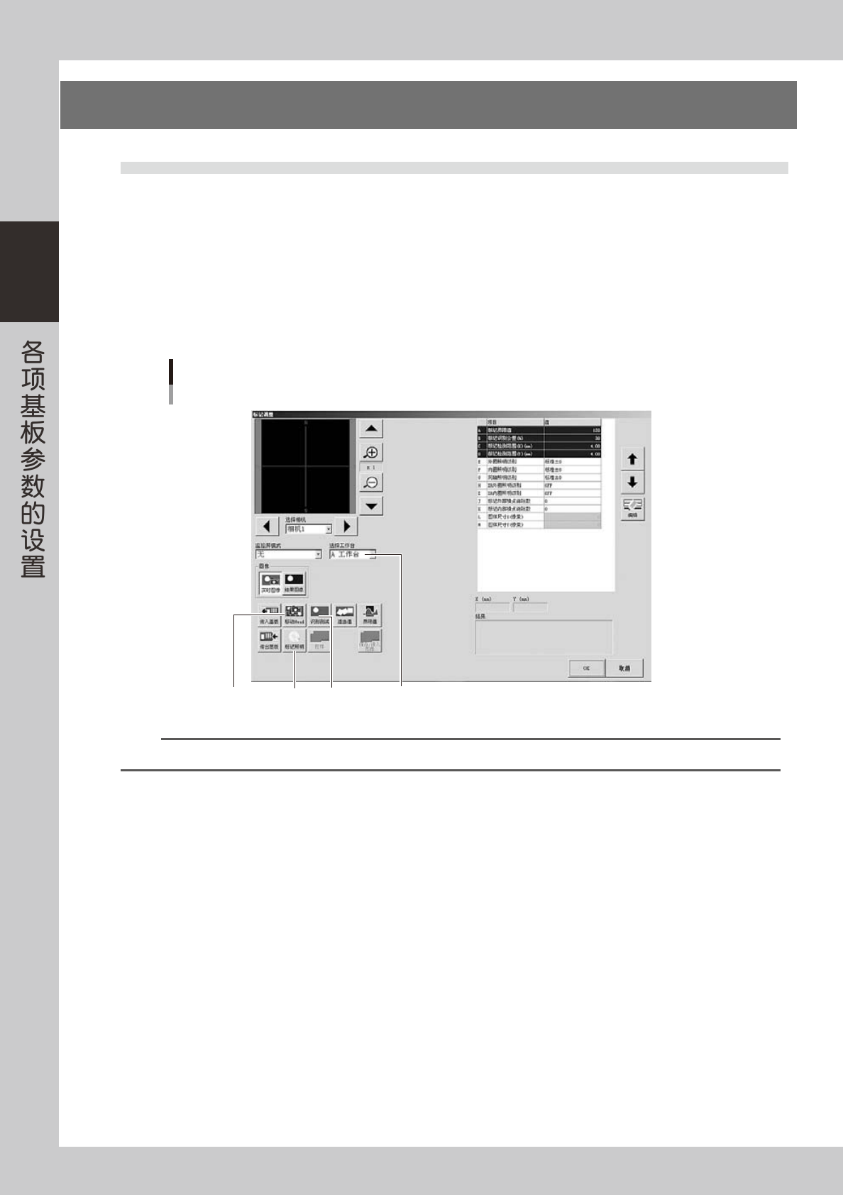 2-58 2 5. 标记识别测试 5.1 进行标记调整 标记调整是确认所设置的参数是否适当的作业。未设置的参数则通过识别测试获取最佳值。 在此,以基本参数的“标记类型”的设置为“基准标记”为例介绍标记的调整方法。 1 选择标记数据。 打开标记画面,将光标移至想要确认的数据行。 2 打开标记调整画面。 按 [ 标记调整 ] 按钮,打开如下图所示画面。 Step 5 Step 4 Step 6 标记调整 以YS24为例 选择工作台 2…